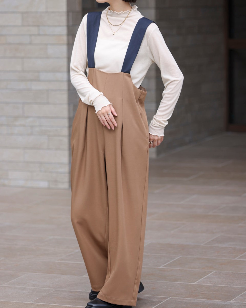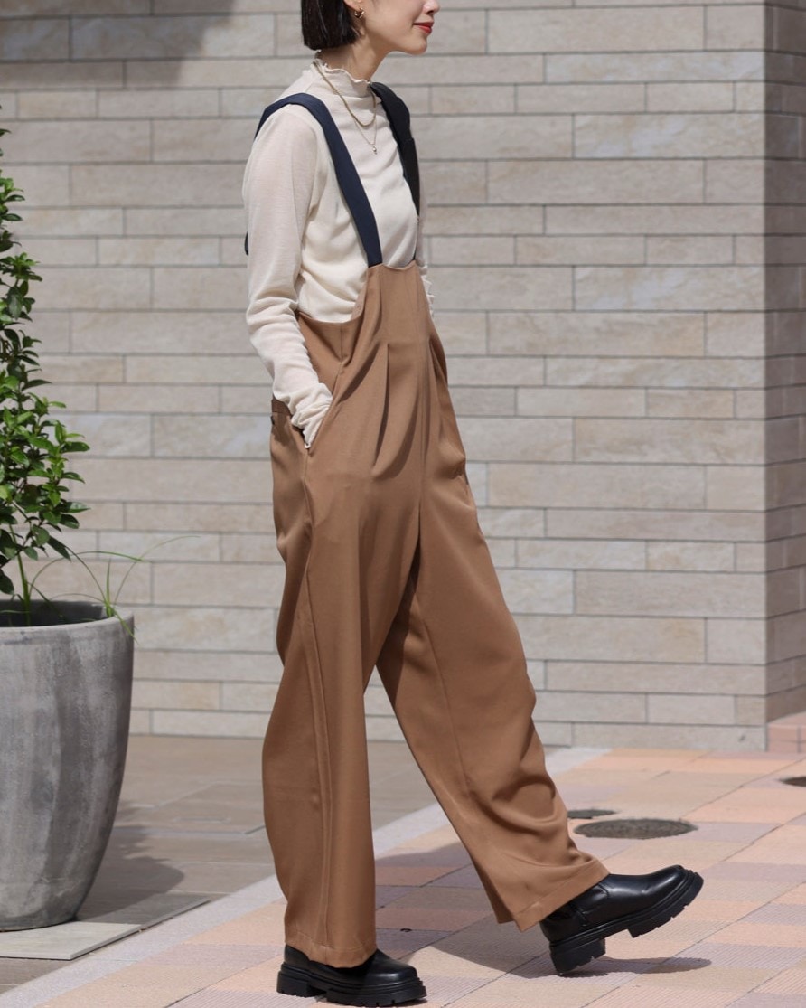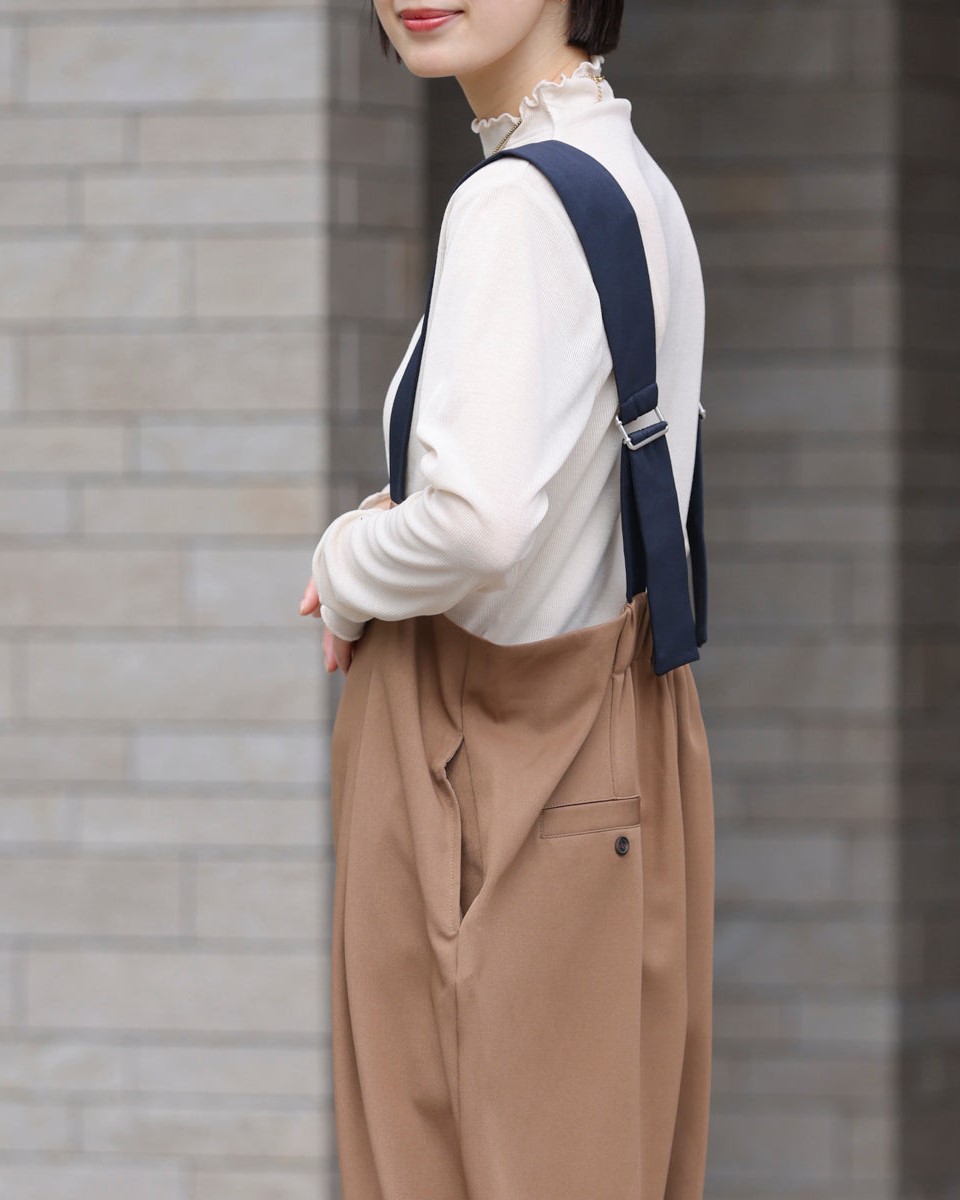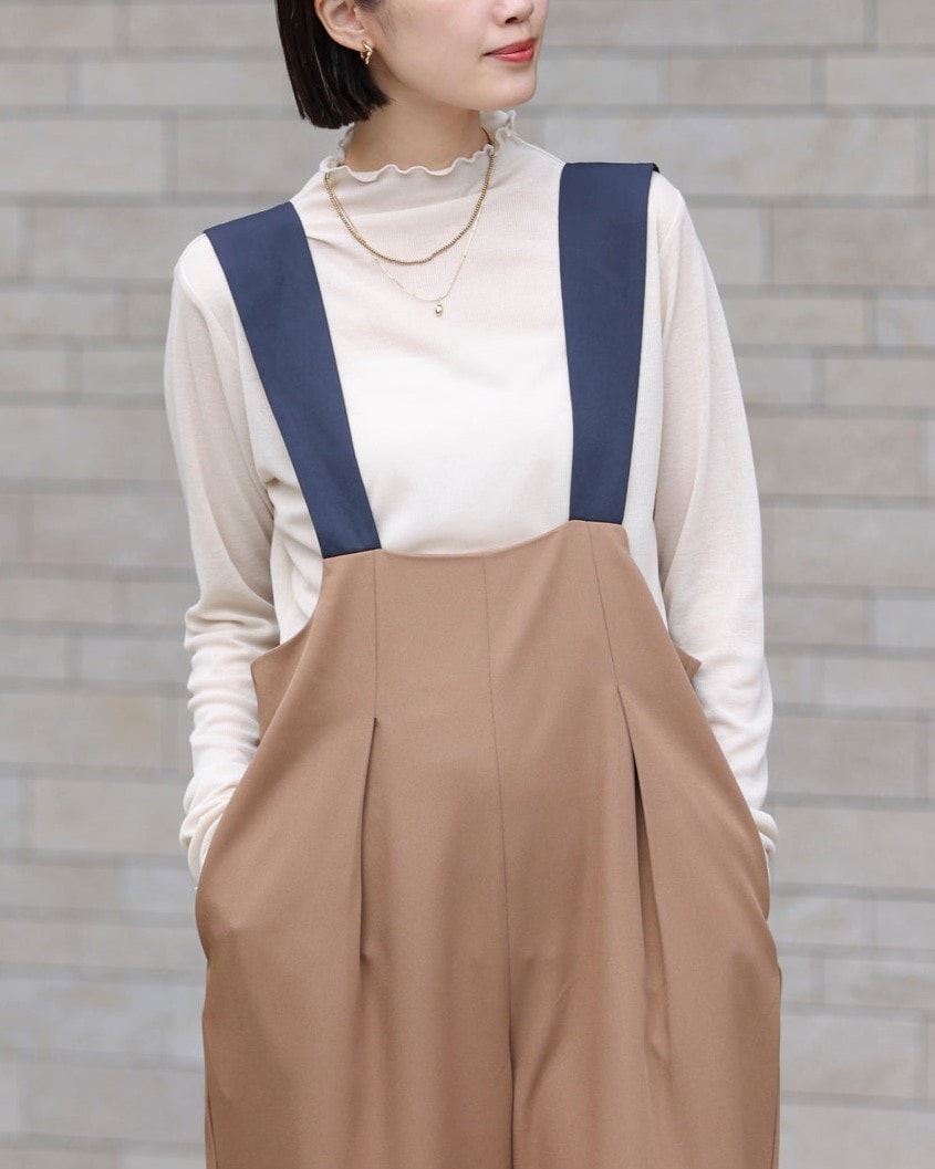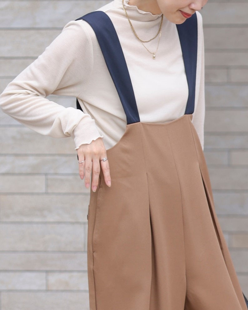 肩ひもをハイショクデザインにしたサロペット。 シンプルなデザインですが、肩ひもをハイショクで太めにすることで見た目のアクセントと肩に優しい作りにしています。 腰回りにはタック、後ろにはゴムが入っているので着心地も快適。 サロペットは肩紐の調節ができるので、身長を気にせず着れることも嬉しいポイントです。