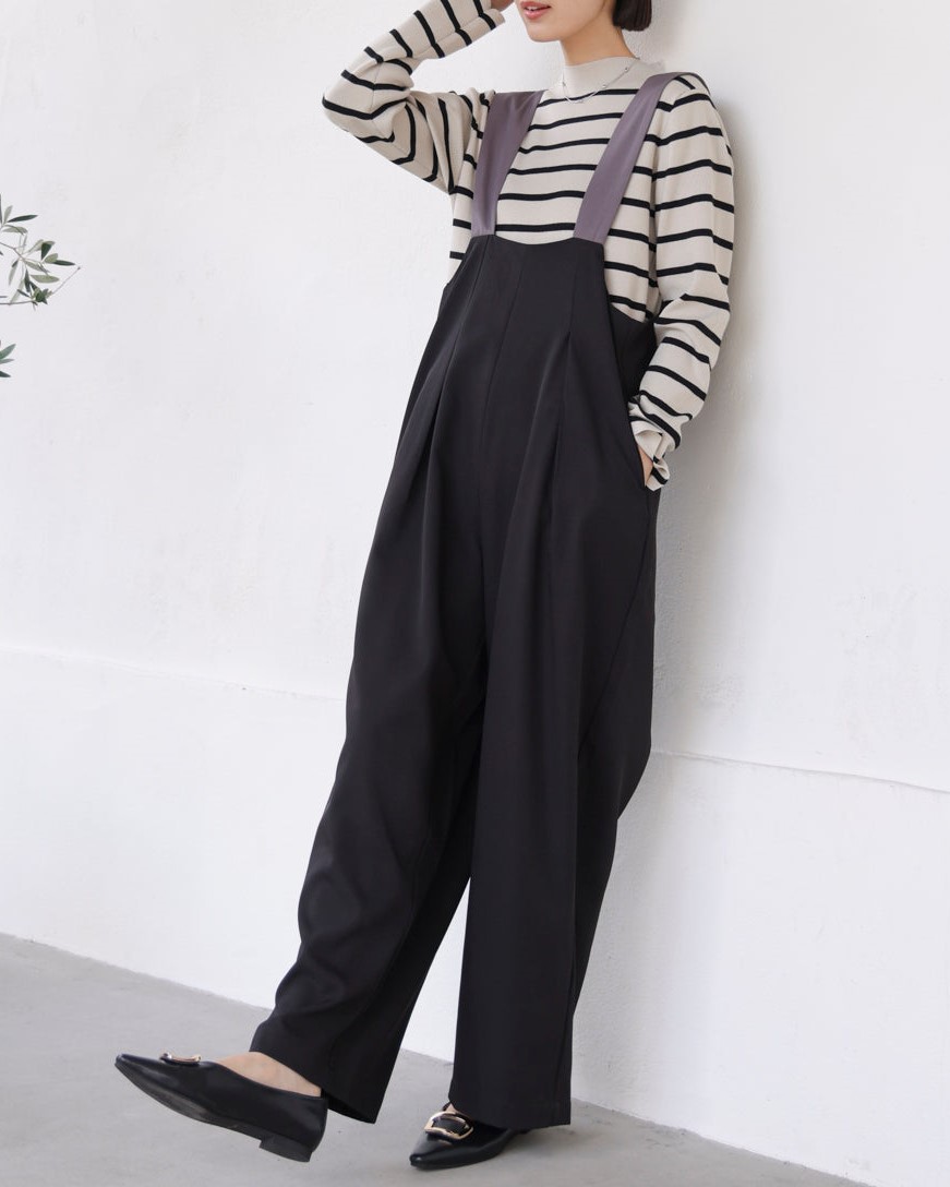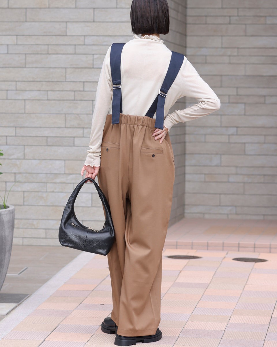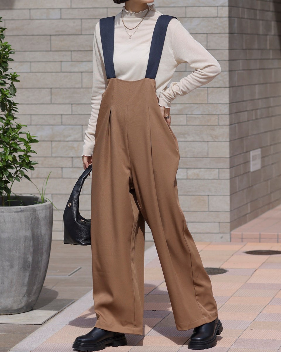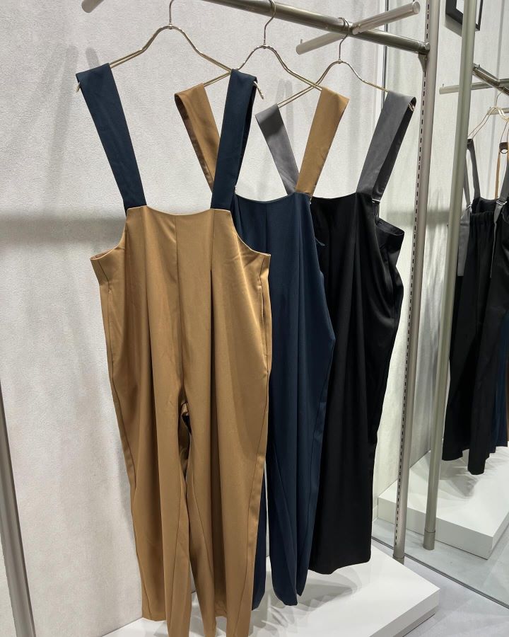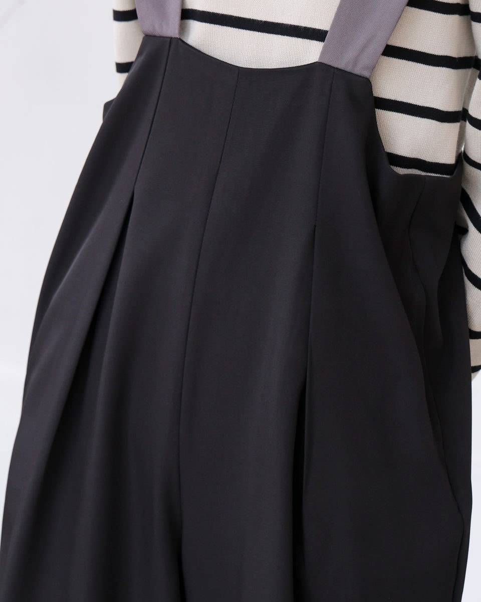 肩ひもをハイショクデザインにしたサロペット。 シンプルなデザインですが、肩ひもをハイショクで太めにすることで見た目のアクセントと肩に優しい作りにしています。 腰回りにはタック、後ろにはゴムが入っているので着心地も快適。 サロペットは肩紐の調節ができるので、身長を気にせず着れることも嬉しいポイントです。
