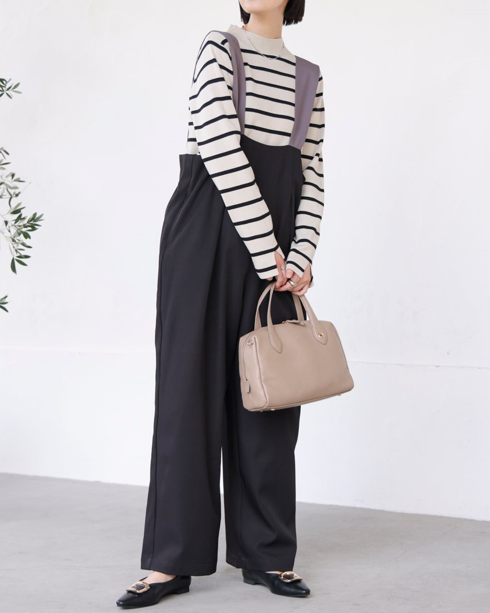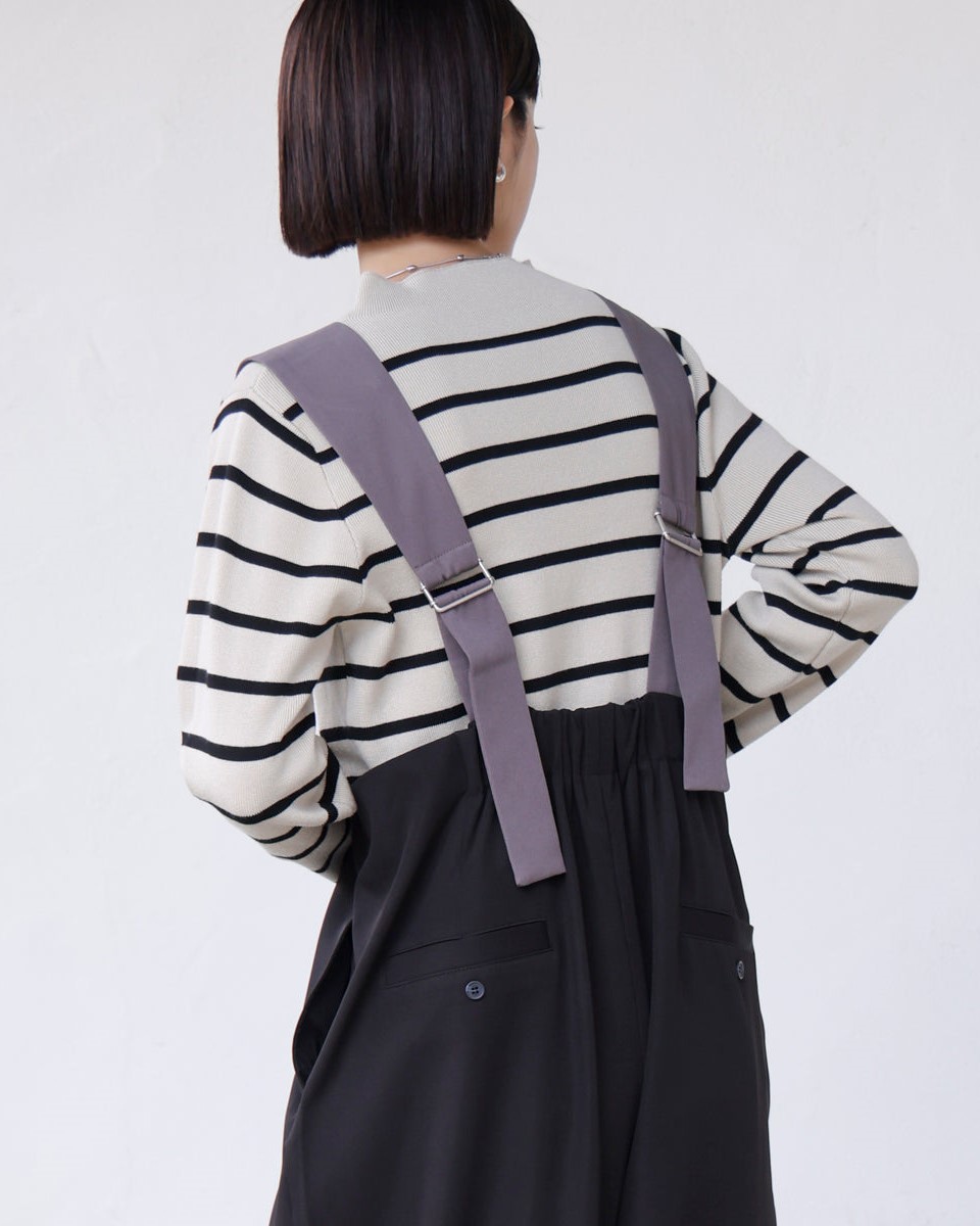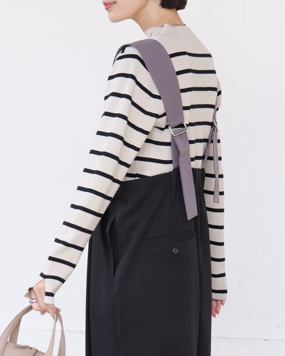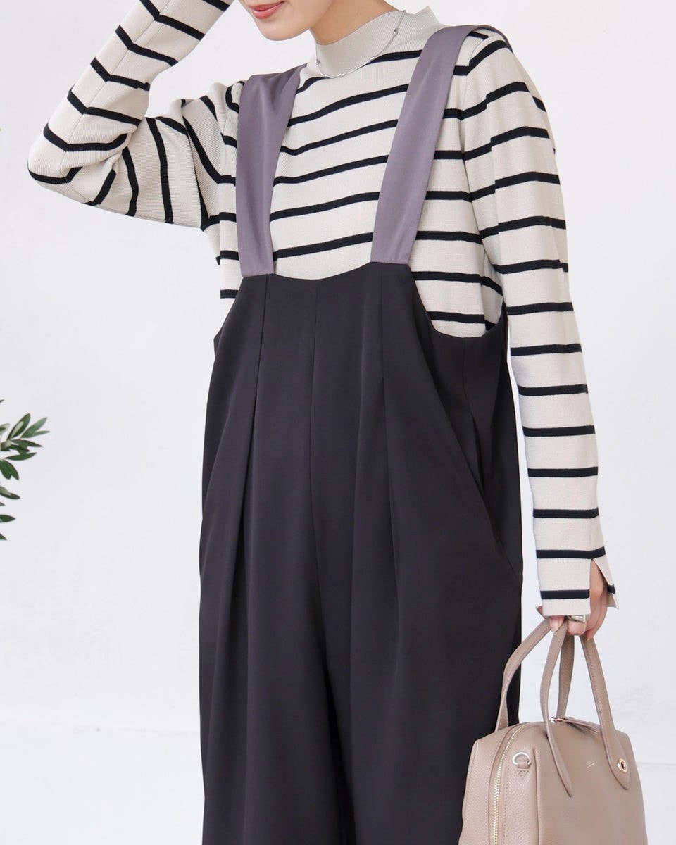 肩ひもをハイショクデザインにしたサロペット。 シンプルなデザインですが、肩ひもをハイショクで太めにすることで見た目のアクセントと肩に優しい作りにしています。 腰回りにはタック、後ろにはゴムが入っているので着心地も快適。 サロペットは肩紐の調節ができるので、身長を気にせず着れることも嬉しいポイントです。