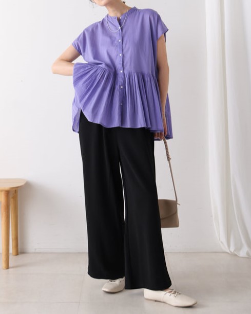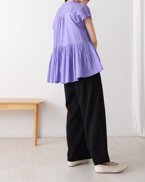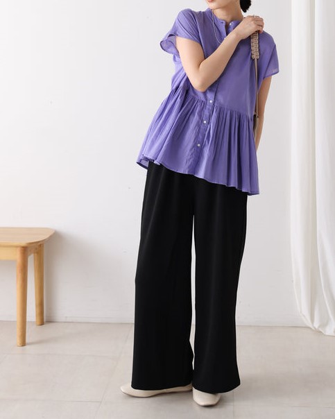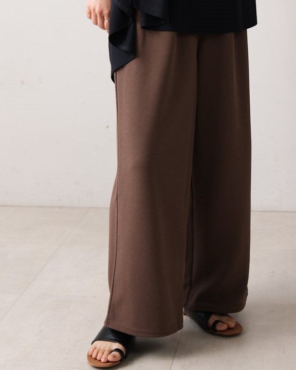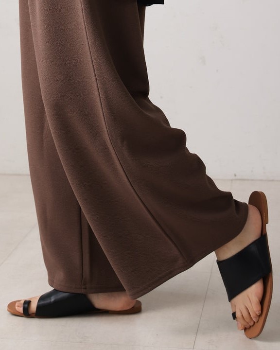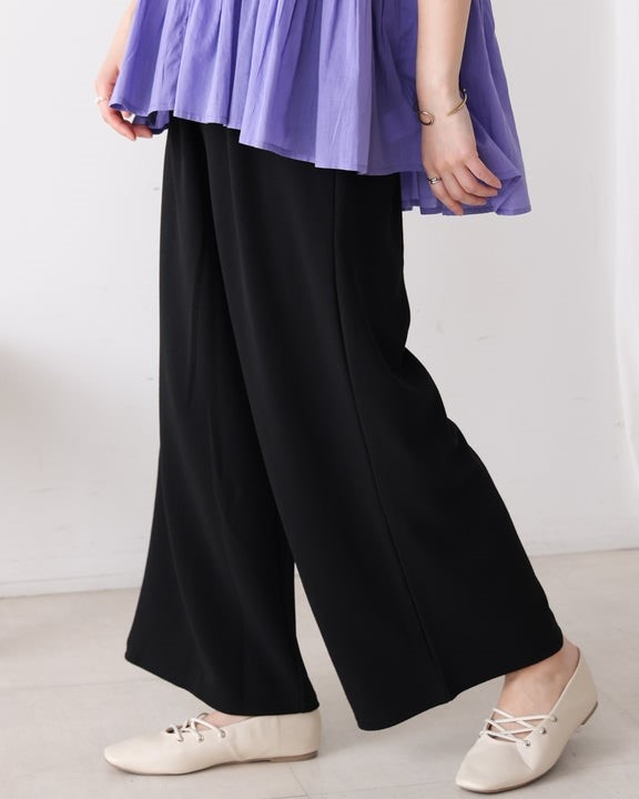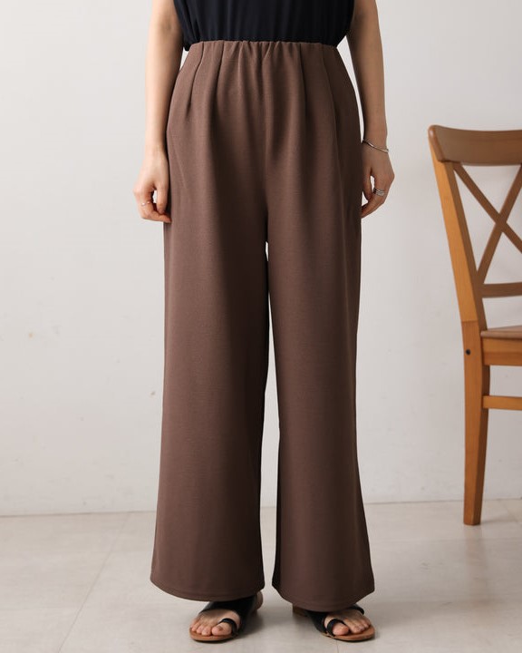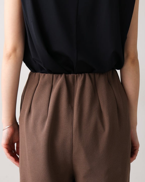 凹凸のあるカットジョーゼット生地を使用したパンツは、ストレッチ性もあり楽ちんな履き心地。 ウエストはゴム仕様なので着脱もしやすいです。 ウエストにあしらったタックでキレイなラインを保ちます。 きちんと感のある素材感なので、カジュアルなシーンからお仕事用などにもお勧めです。