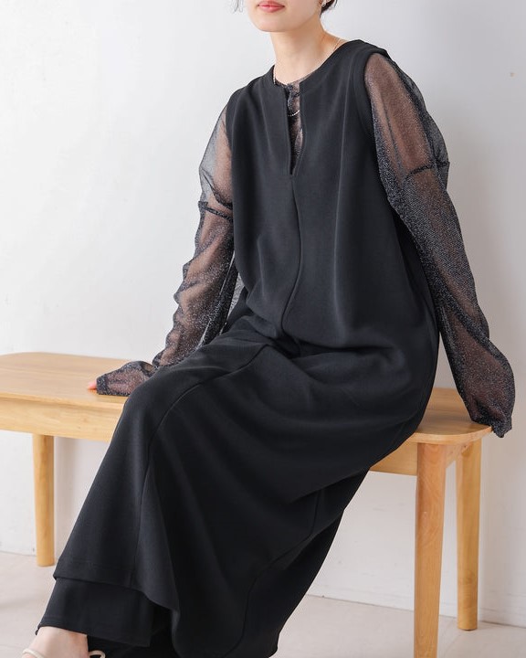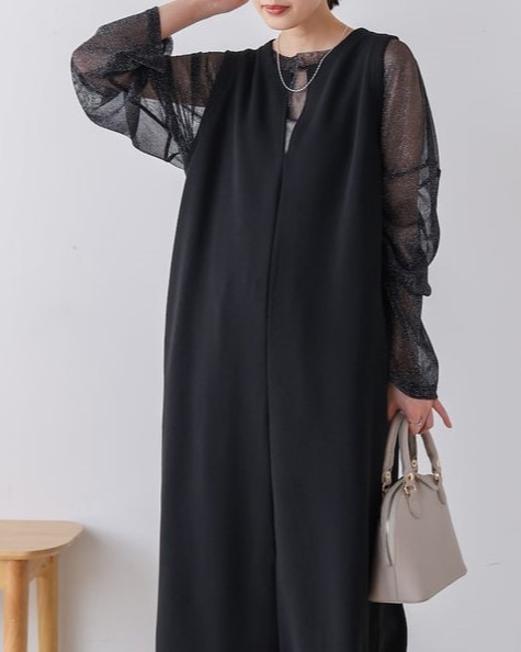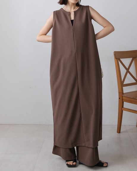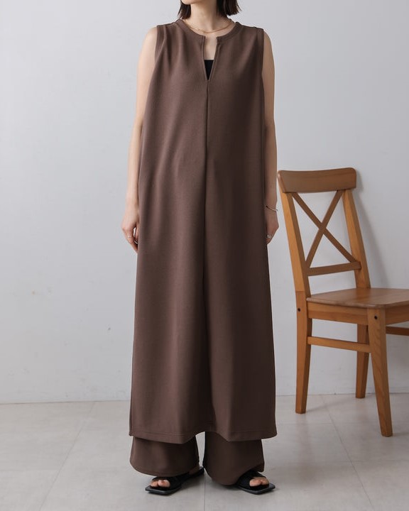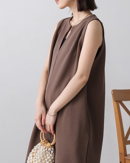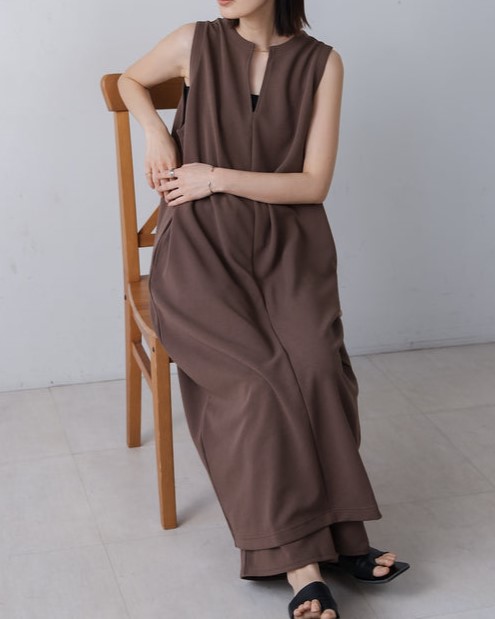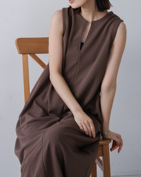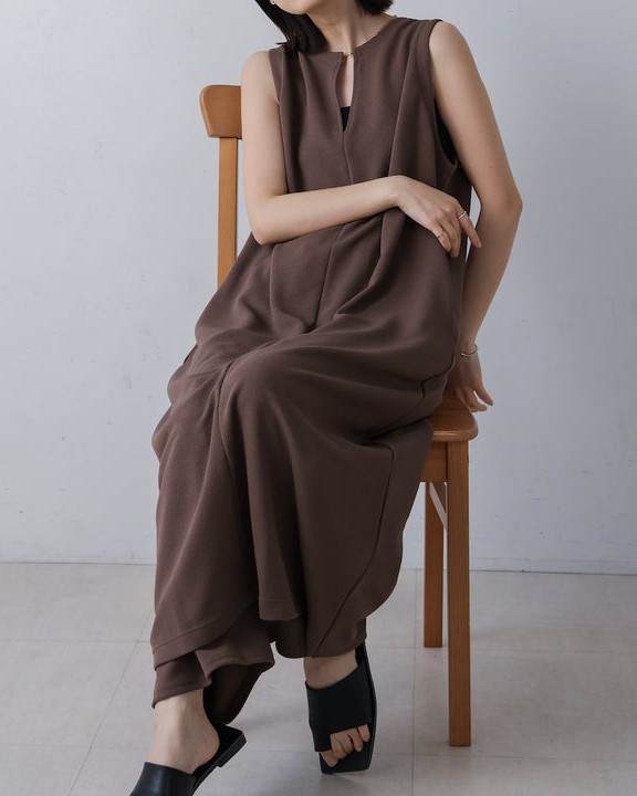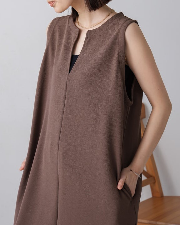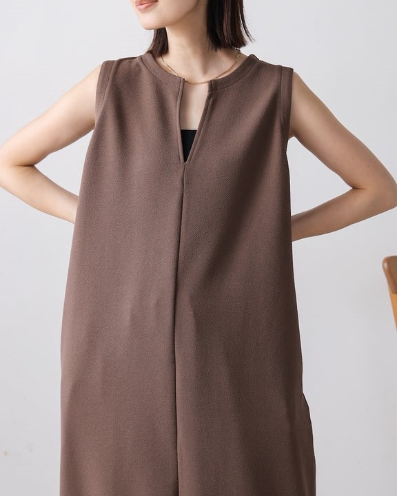 凹凸のあるカットジョーゼット生地を使用したジャンパースカート。 トレンドのキーネックデザインで、こなれたレイヤードスタイルに◎ ゆったりとしたサイズ感で身体のラインも拾わないのも嬉しいポイント。 きちんと感のある素材感なので、カジュアルなシーンからお出かけなどにもお勧めです。 しわにもなりにくいので、旅行など長時間の移動にもお勧めです。