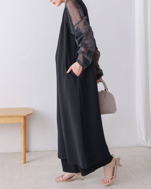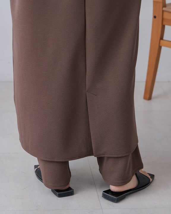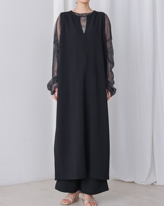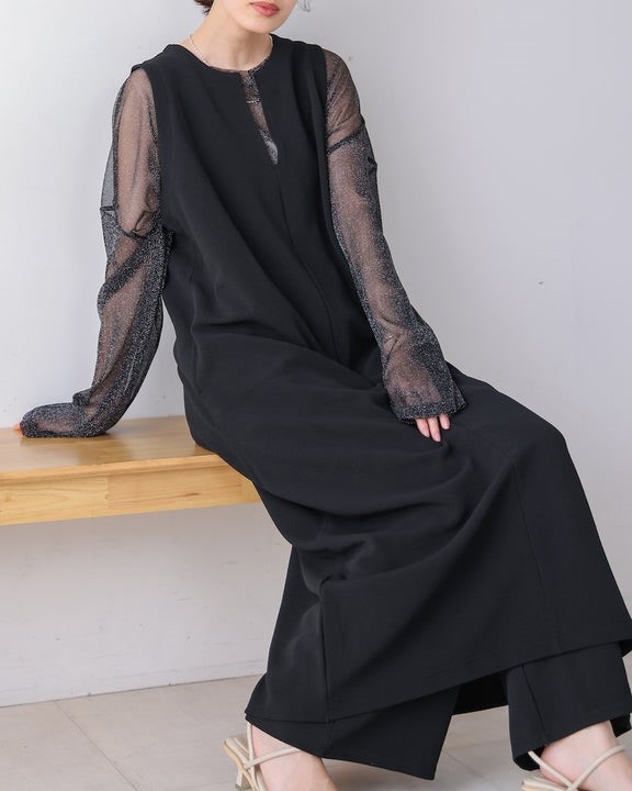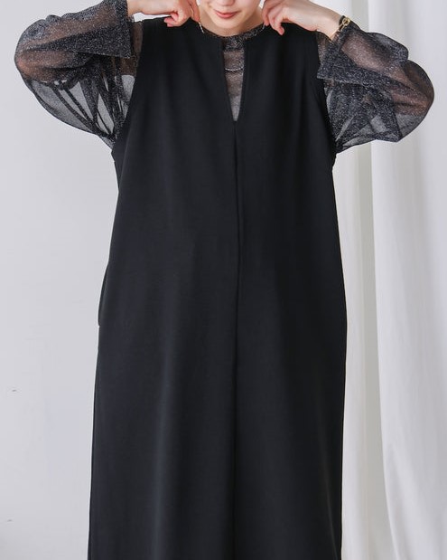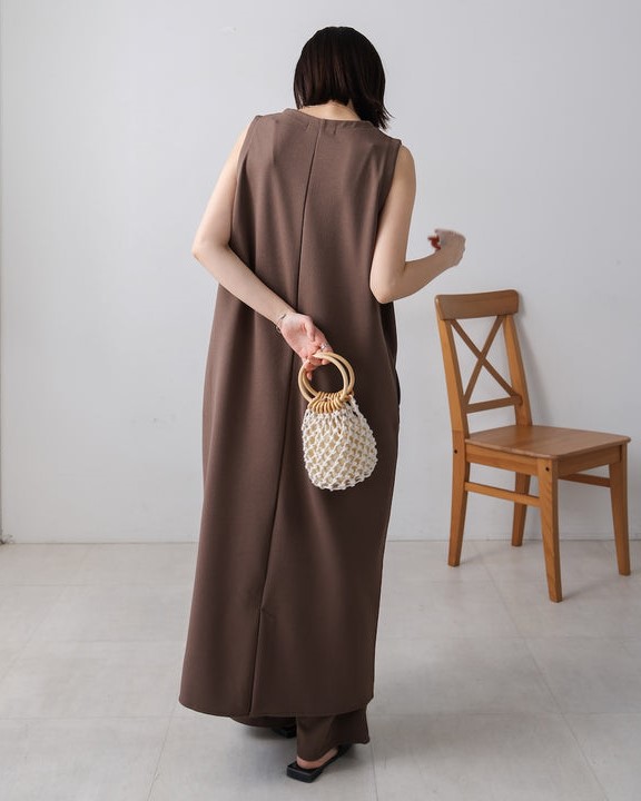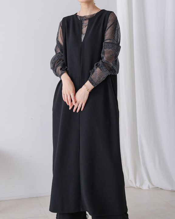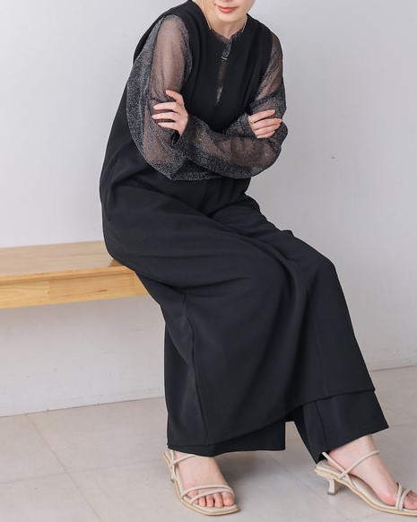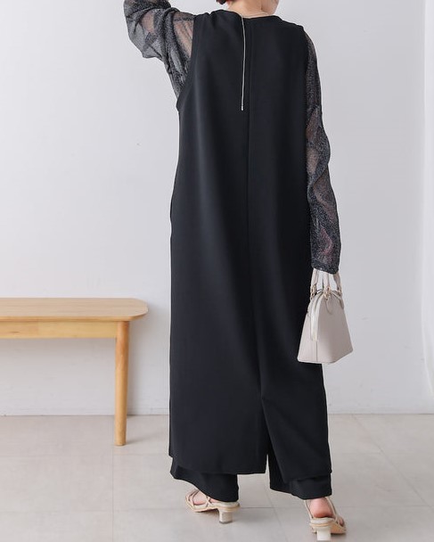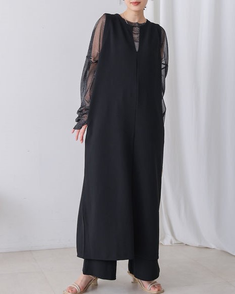 凹凸のあるカットジョーゼット生地を使用したジャンパースカート。 トレンドのキーネックデザインで、こなれたレイヤードスタイルに◎ ゆったりとしたサイズ感で身体のラインも拾わないのも嬉しいポイント。 きちんと感のある素材感なので、カジュアルなシーンからお出かけなどにもお勧めです。 しわにもなりにくいので、旅行など長時間の移動にもお勧めです。