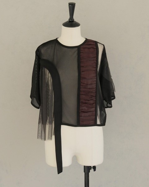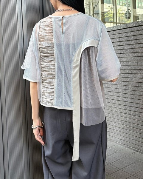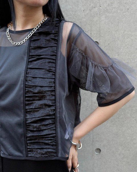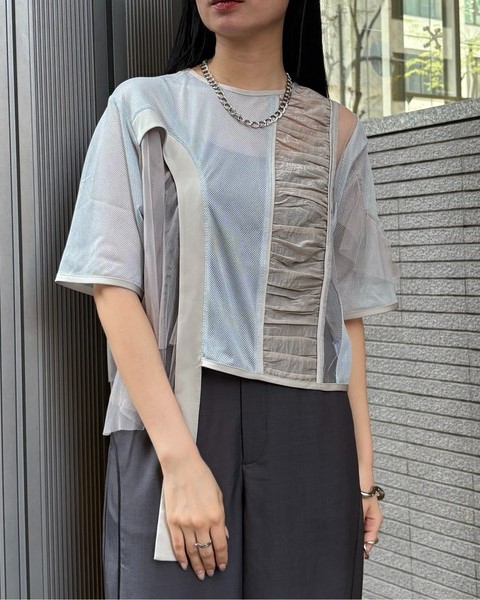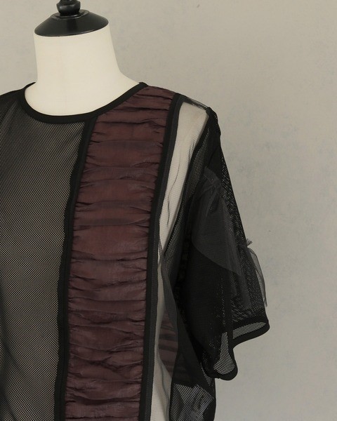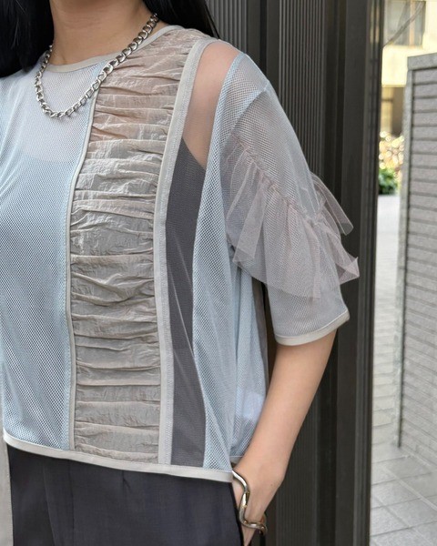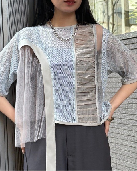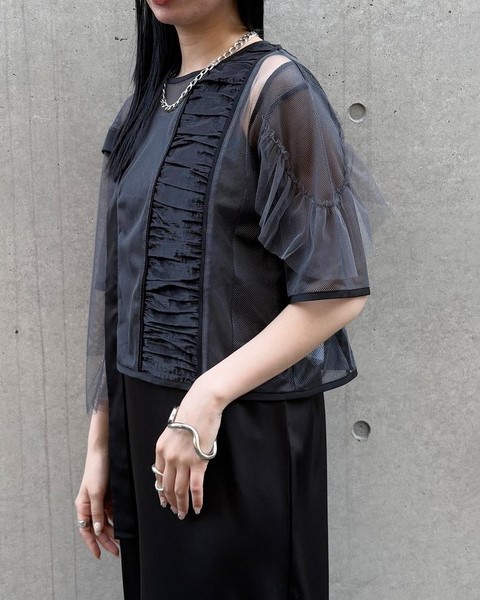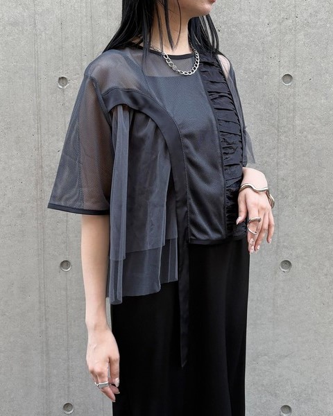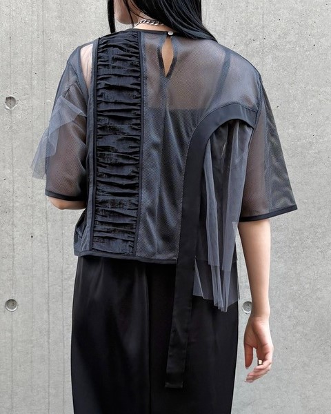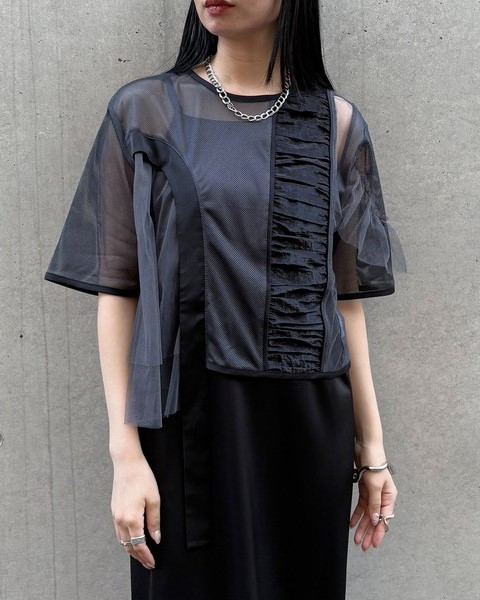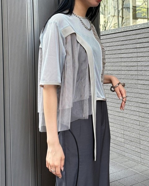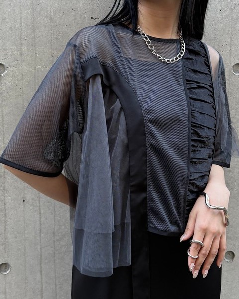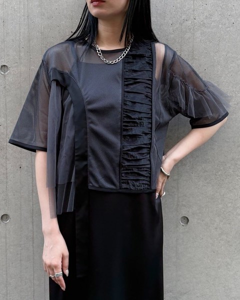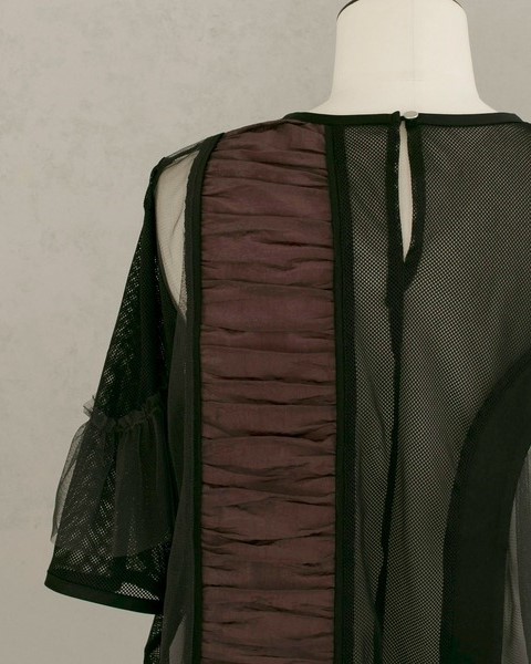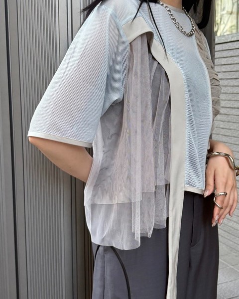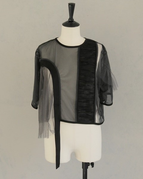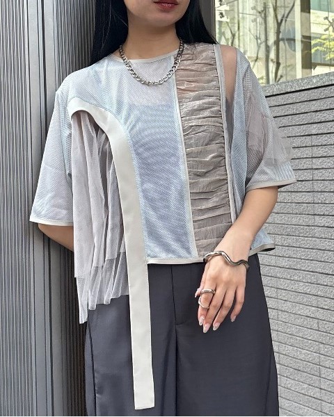 ・メッシュとチュールをアシンメトリーに配置することで、抜け感と立体感を演出。
