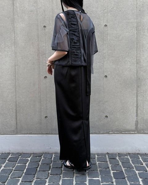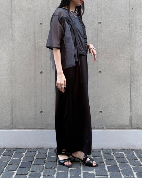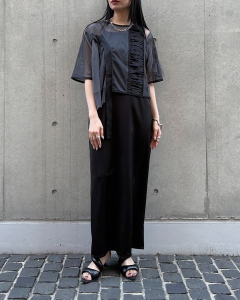 左側の袖と右側にはチュール素材が重なっており、立体感と動きが出るデザイン。