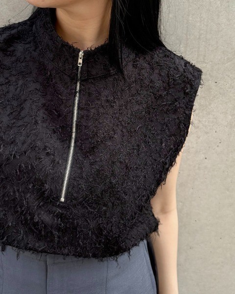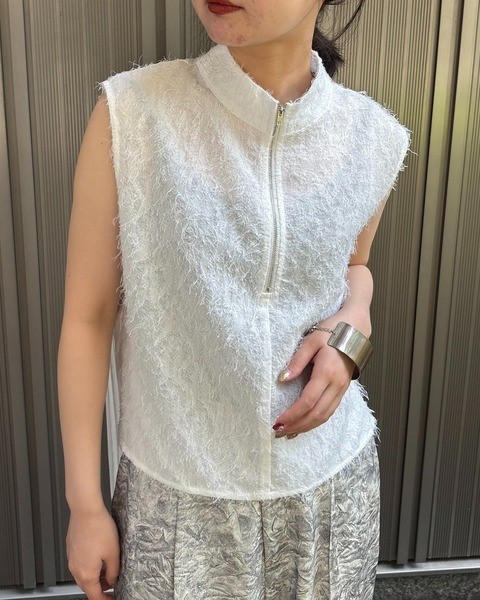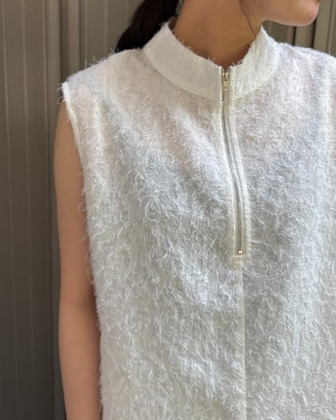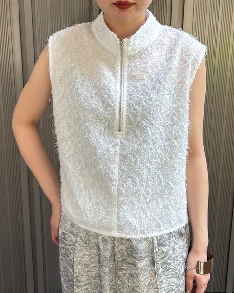 フリンジジャガード素材にハーフジップを取り入れた、トレンド感あふれる一枚。