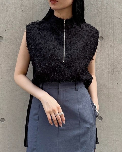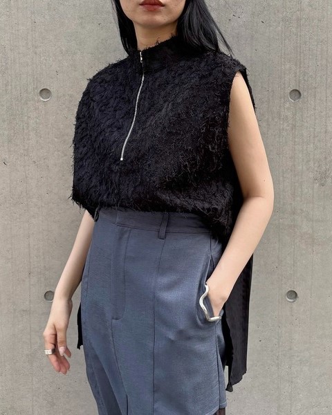 シルバーカラーのハーフジップと、やや高めのスタンドカラーが程よいモード感を演出◎