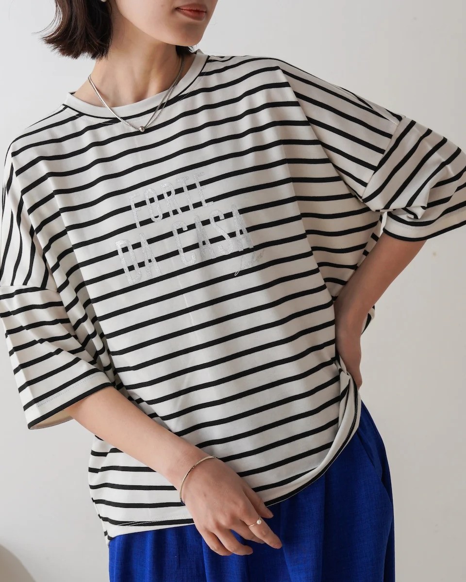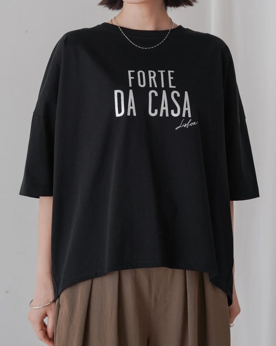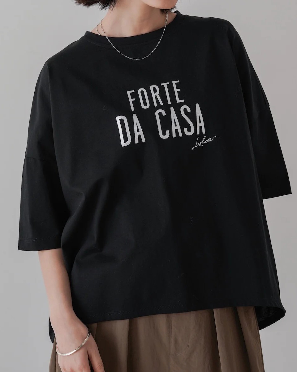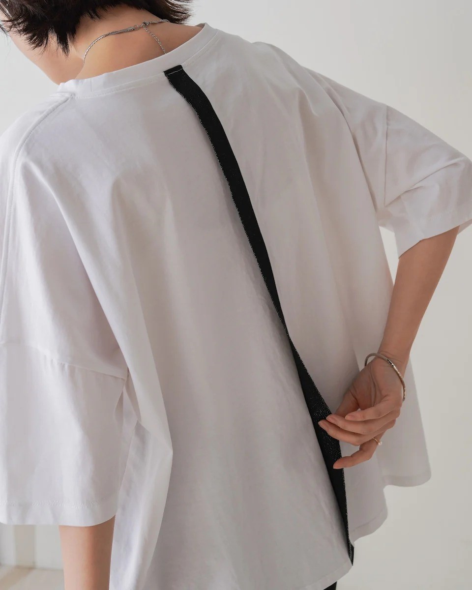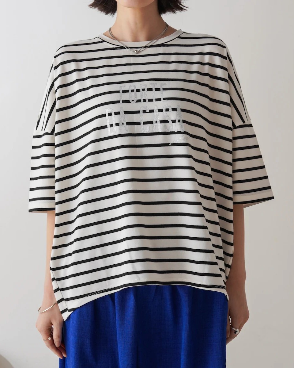 毎年人気のWシルケットシリーズからNEWロゴTシャツの登場です ロゴはポルトガルのとあるホテルのイメージをモチーフに 夏に旅行に駆け出したくなる様なワクワクする高揚感をイメージして製作しました 後ろのラメ混ラインテープもアクセントになりバックスタイルに抜かりがないのもポイント