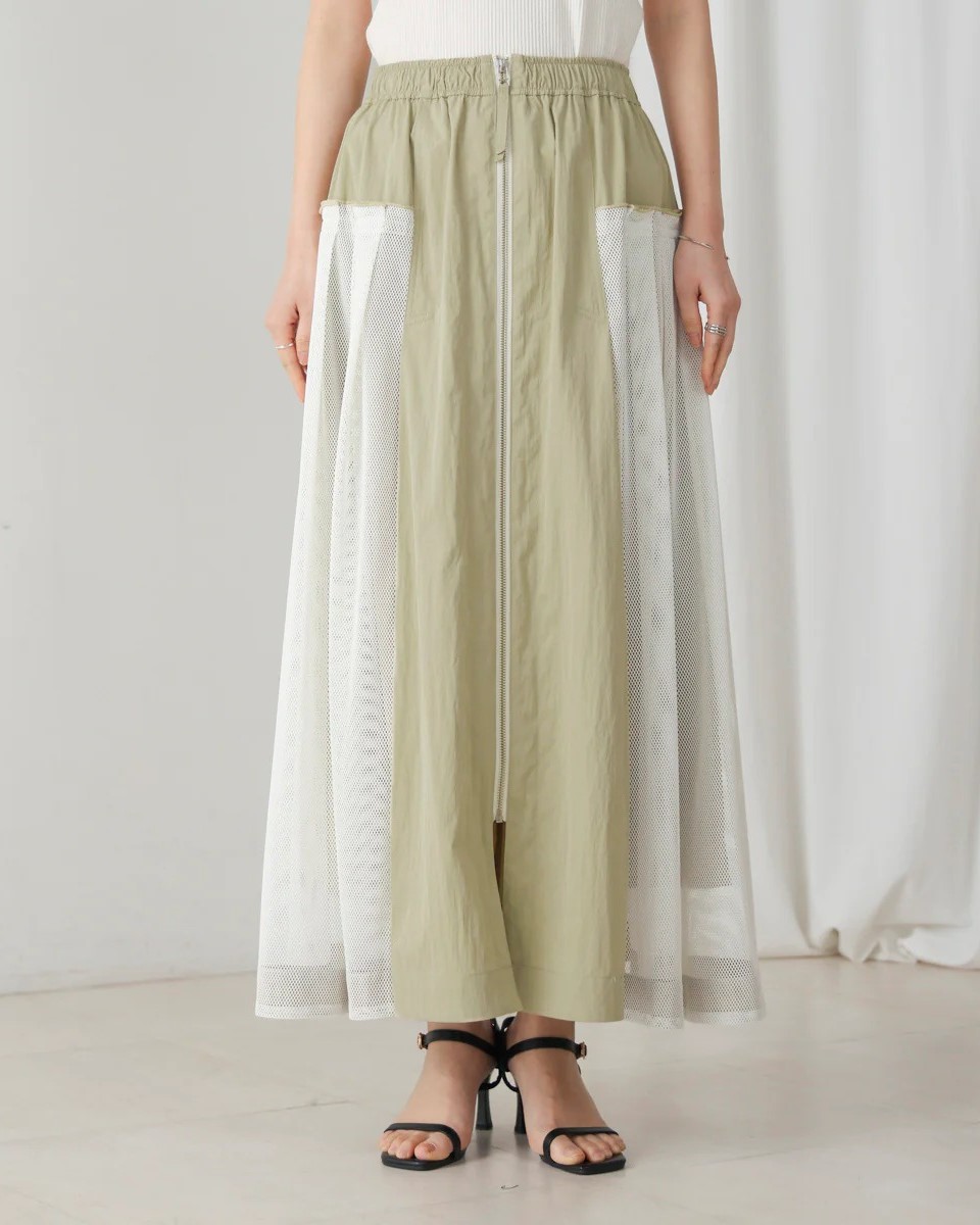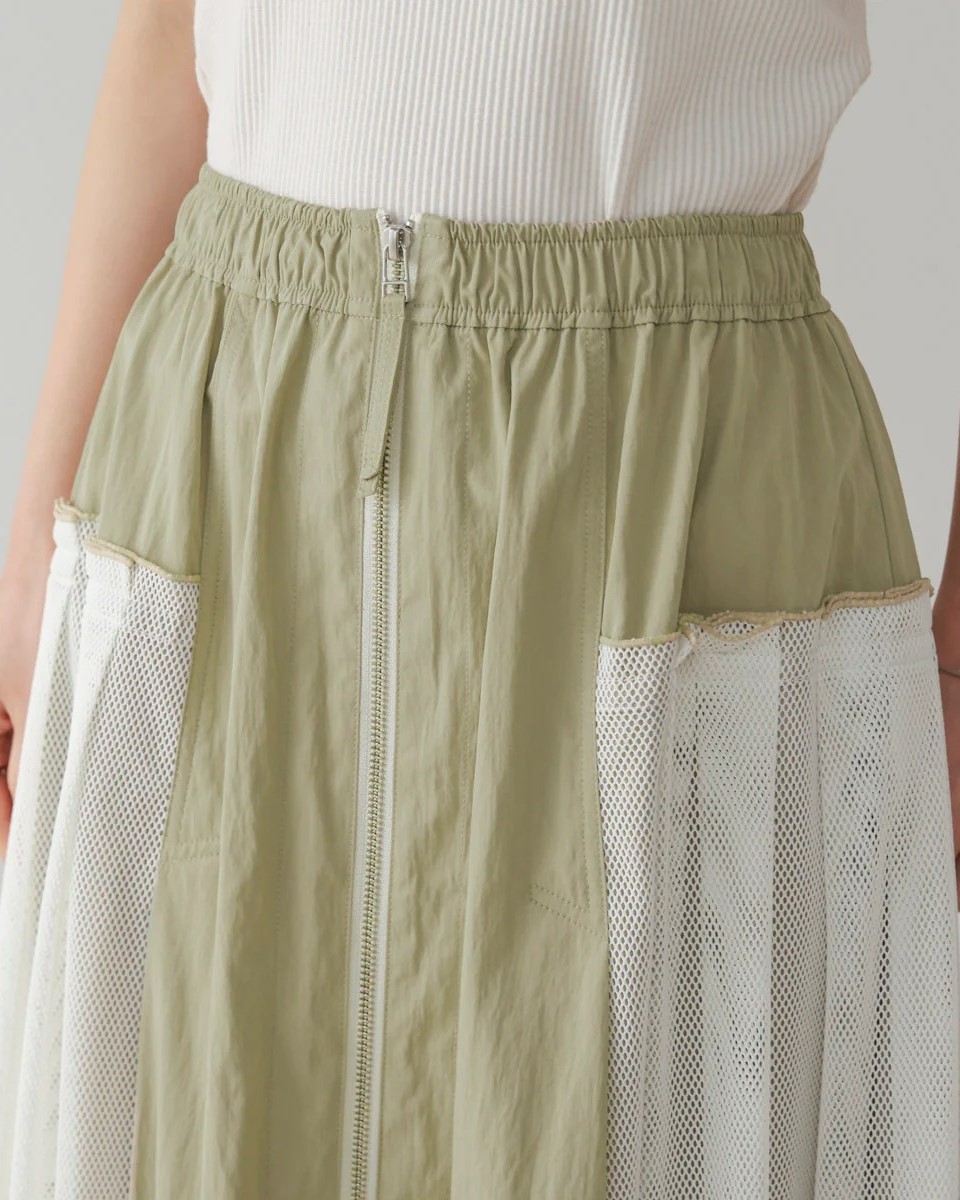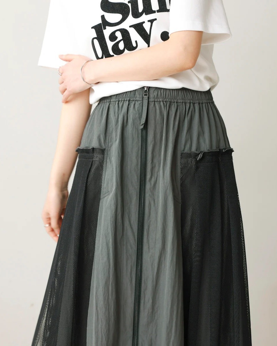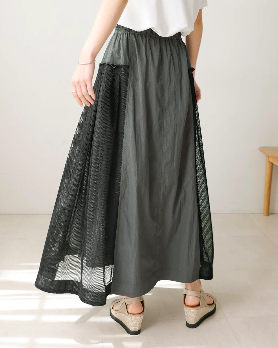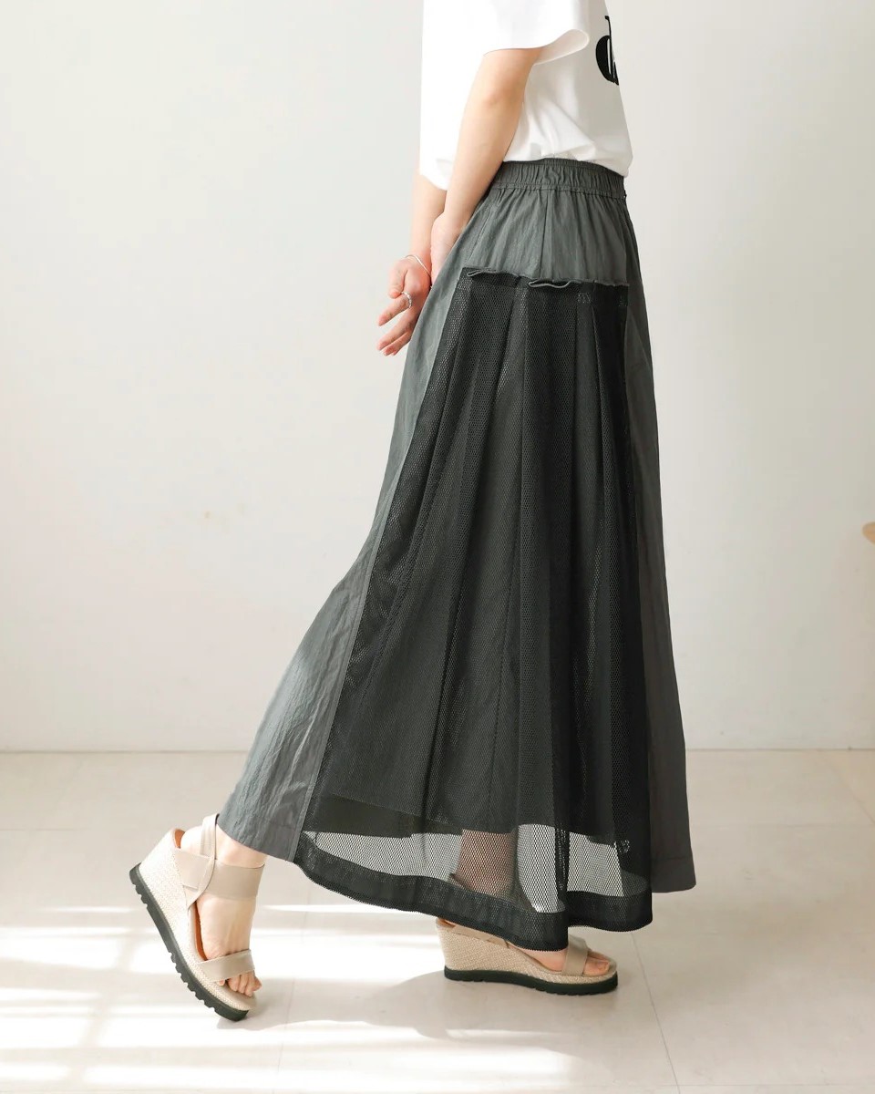 ナイロン×メッシュの異素材コンビで、スポーティブルな要素を取り入れつつ、女性らしさのあるフレアシルエットに仕上げたスカート。