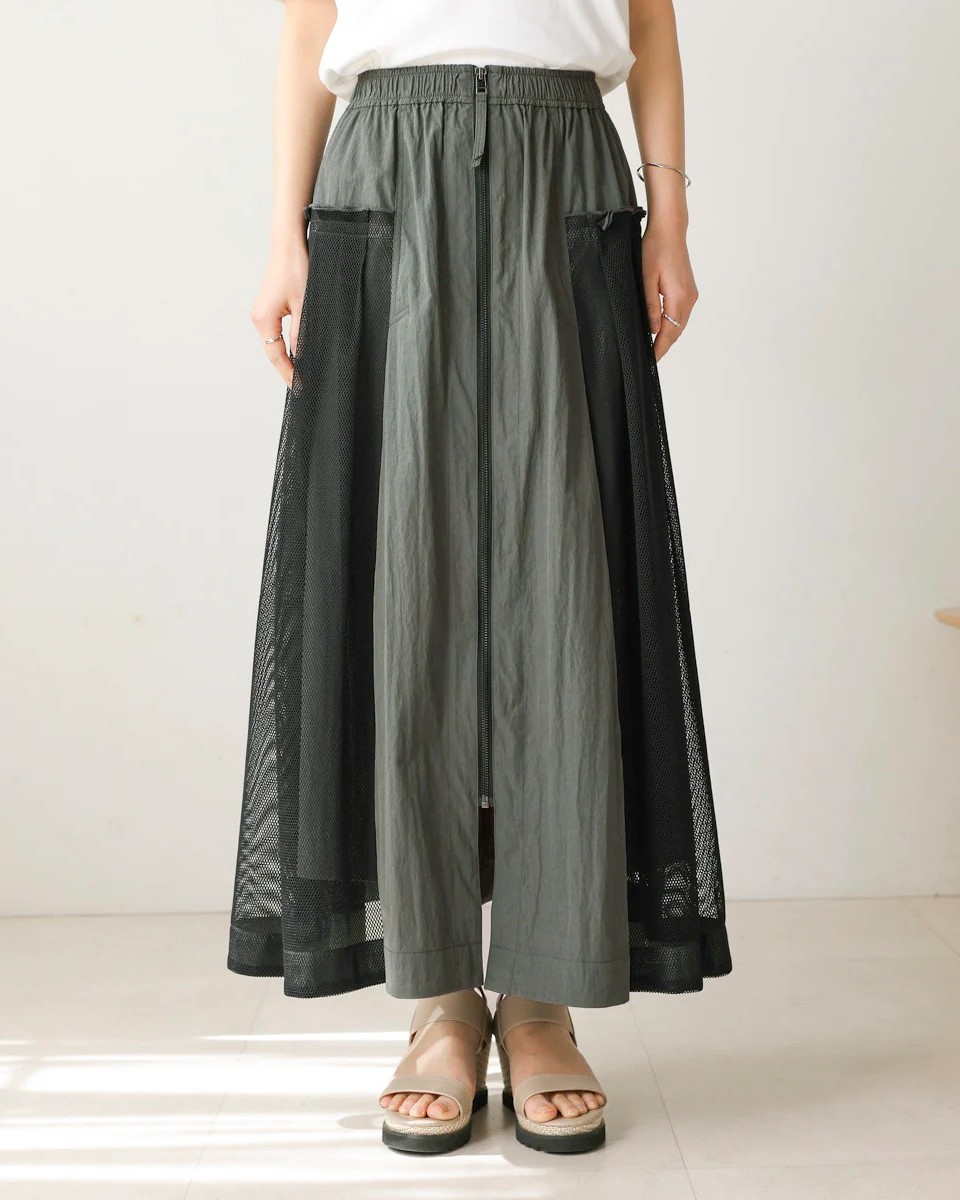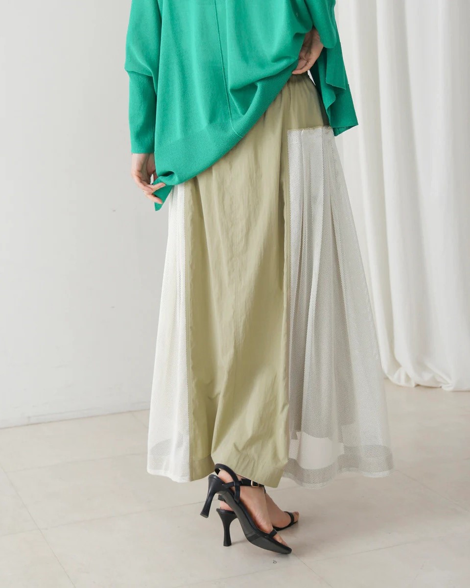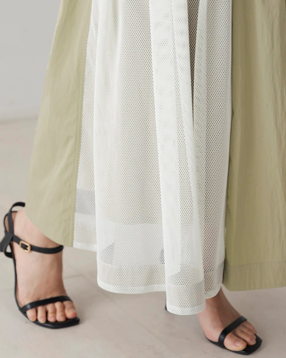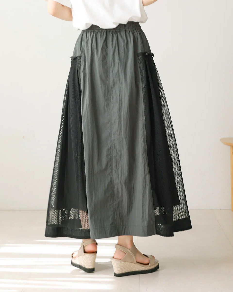 ナイロン×メッシュの異素材コンビで、スポーティブルな要素を取り入れつつ、女性らしさのあるフレアシルエットに仕上げたスカート。