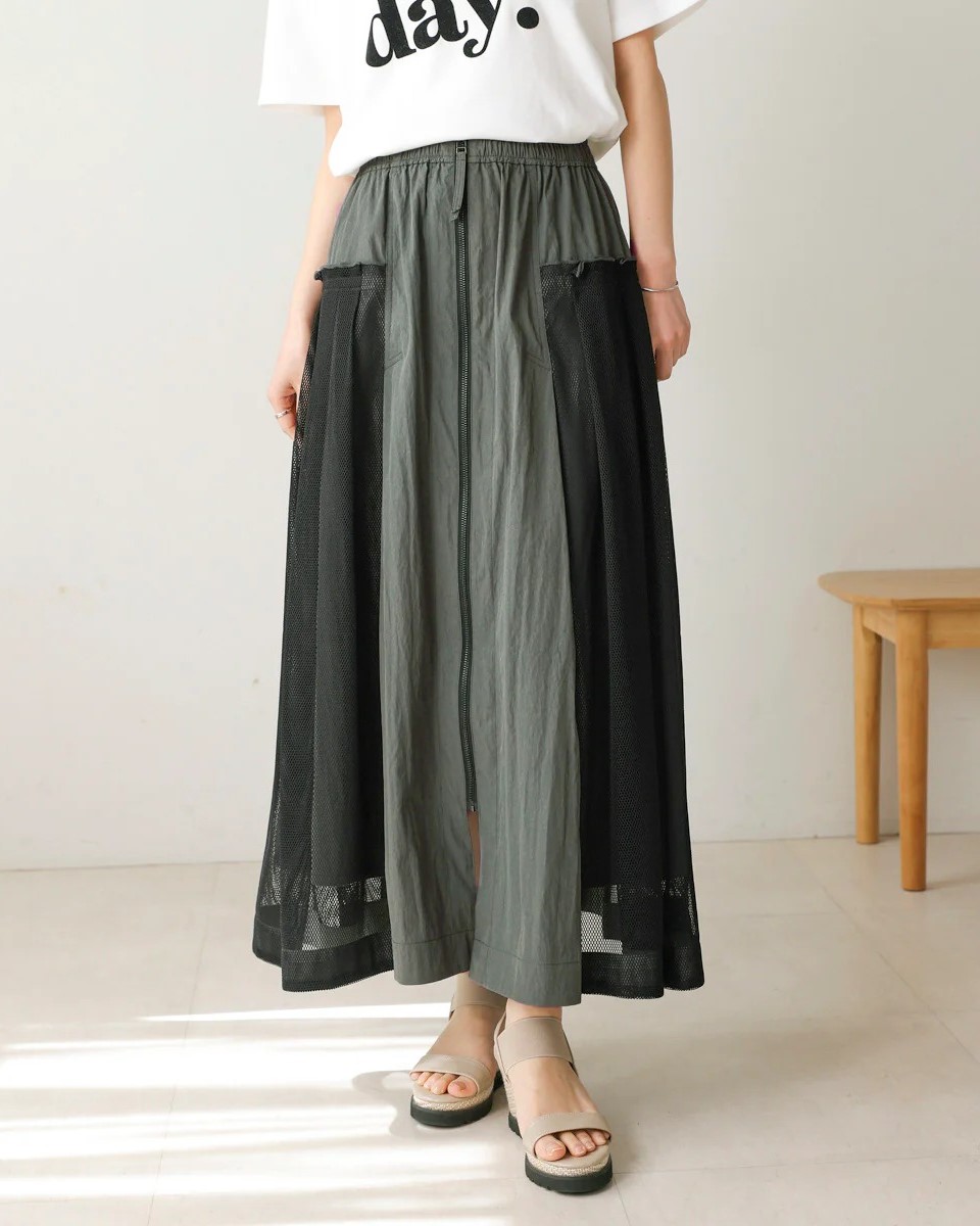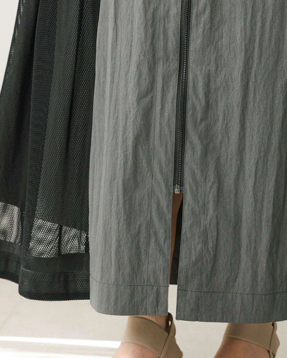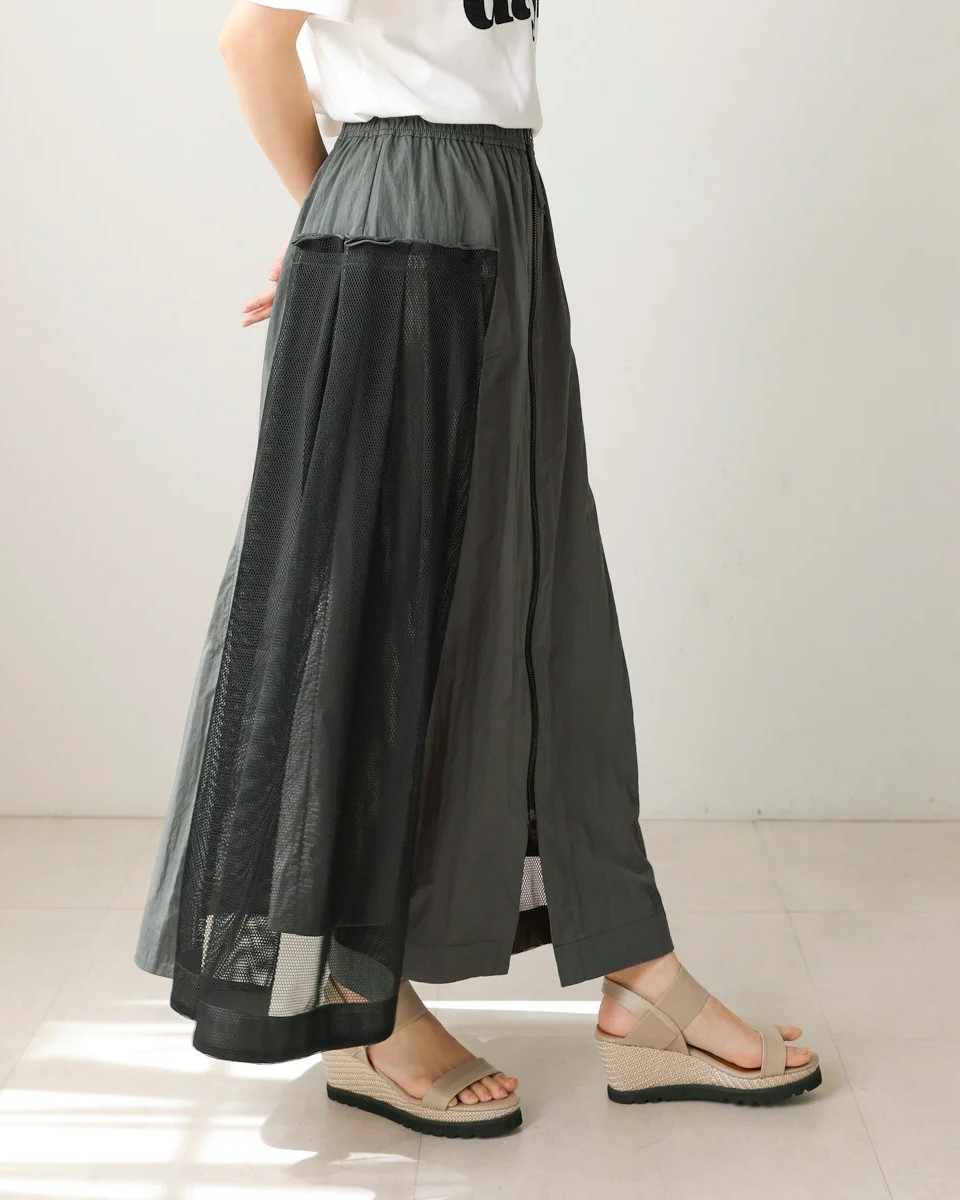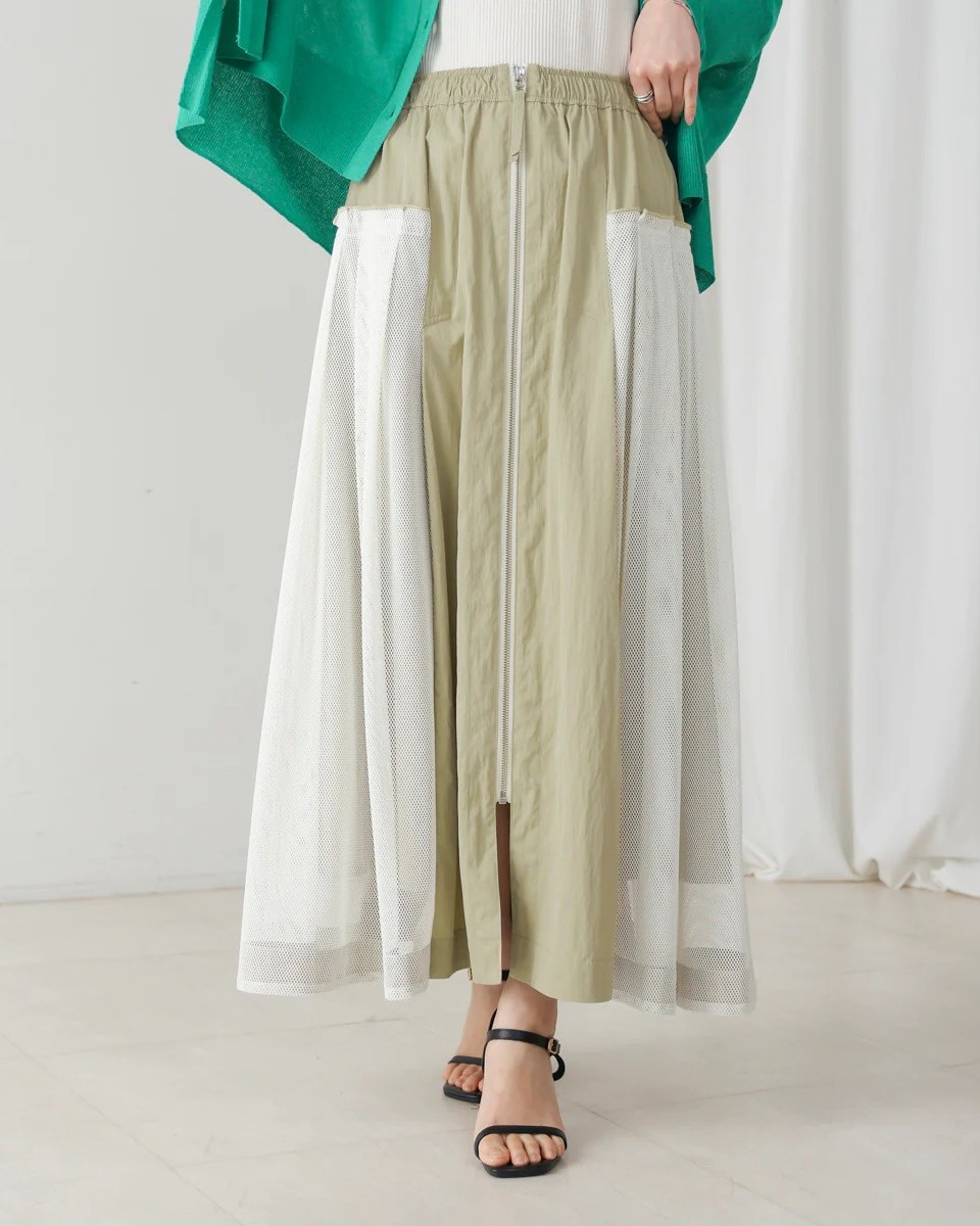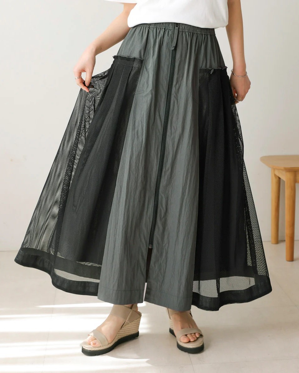 ナイロン×メッシュの異素材コンビで、スポーティブルな要素を取り入れつつ、女性らしさのあるフレアシルエットに仕上げたスカート。