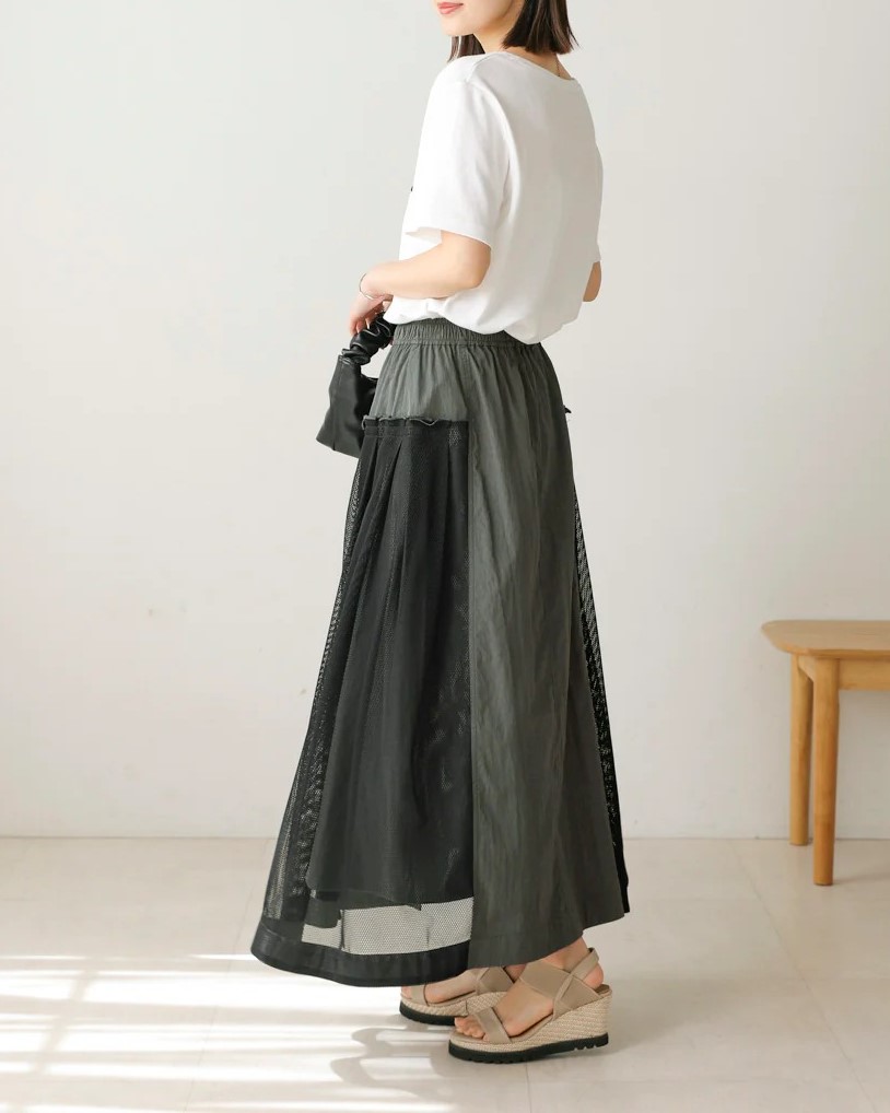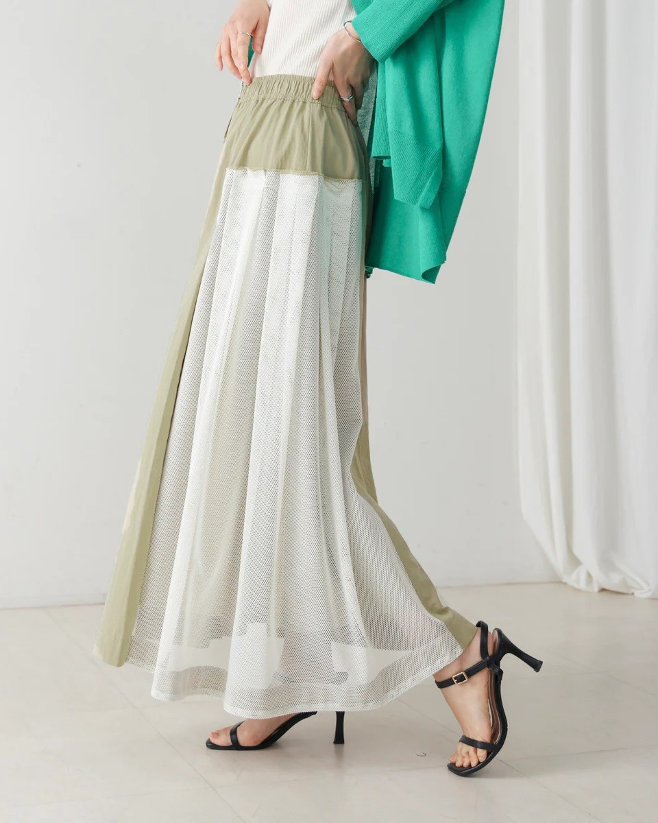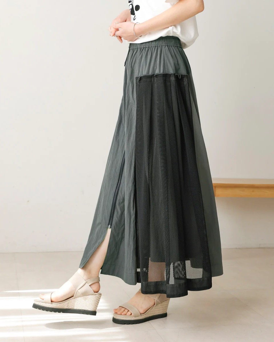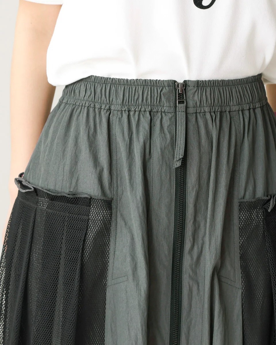 ナイロン×メッシュの異素材コンビで、スポーティブルな要素を取り入れつつ、女性らしさのあるフレアシルエットに仕上げたスカート。