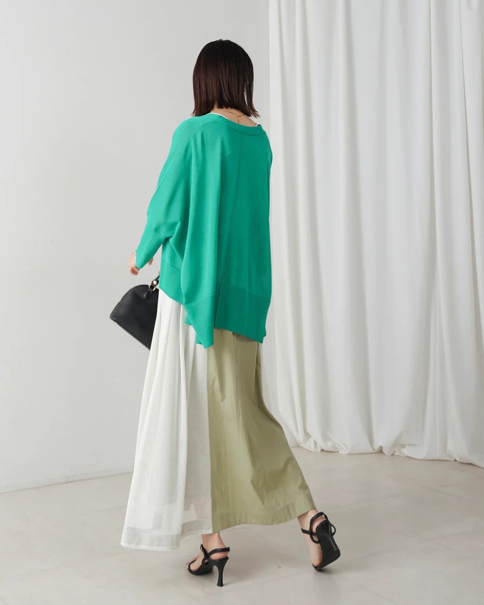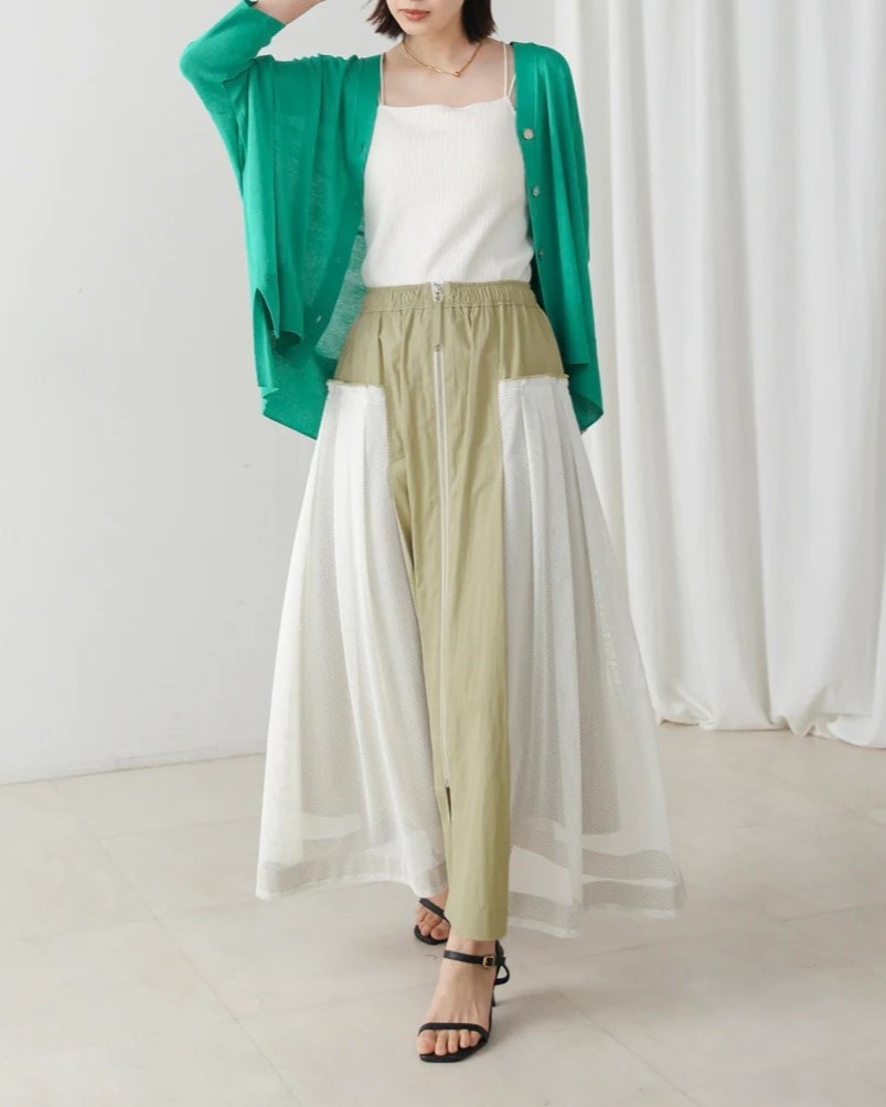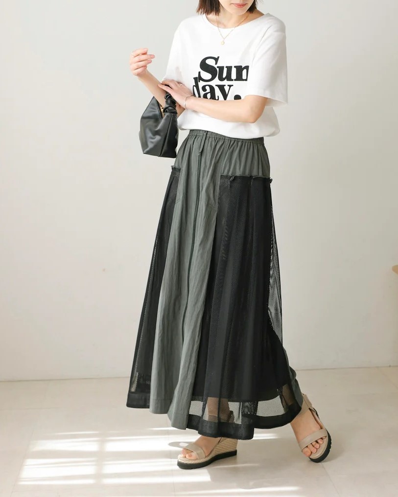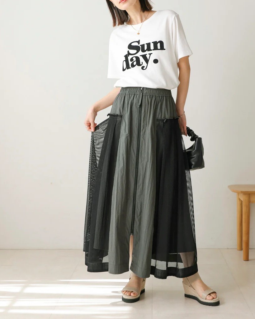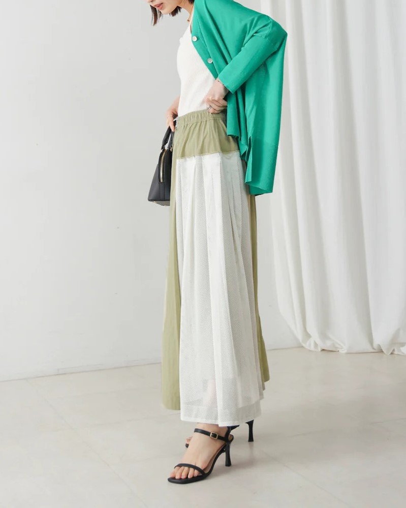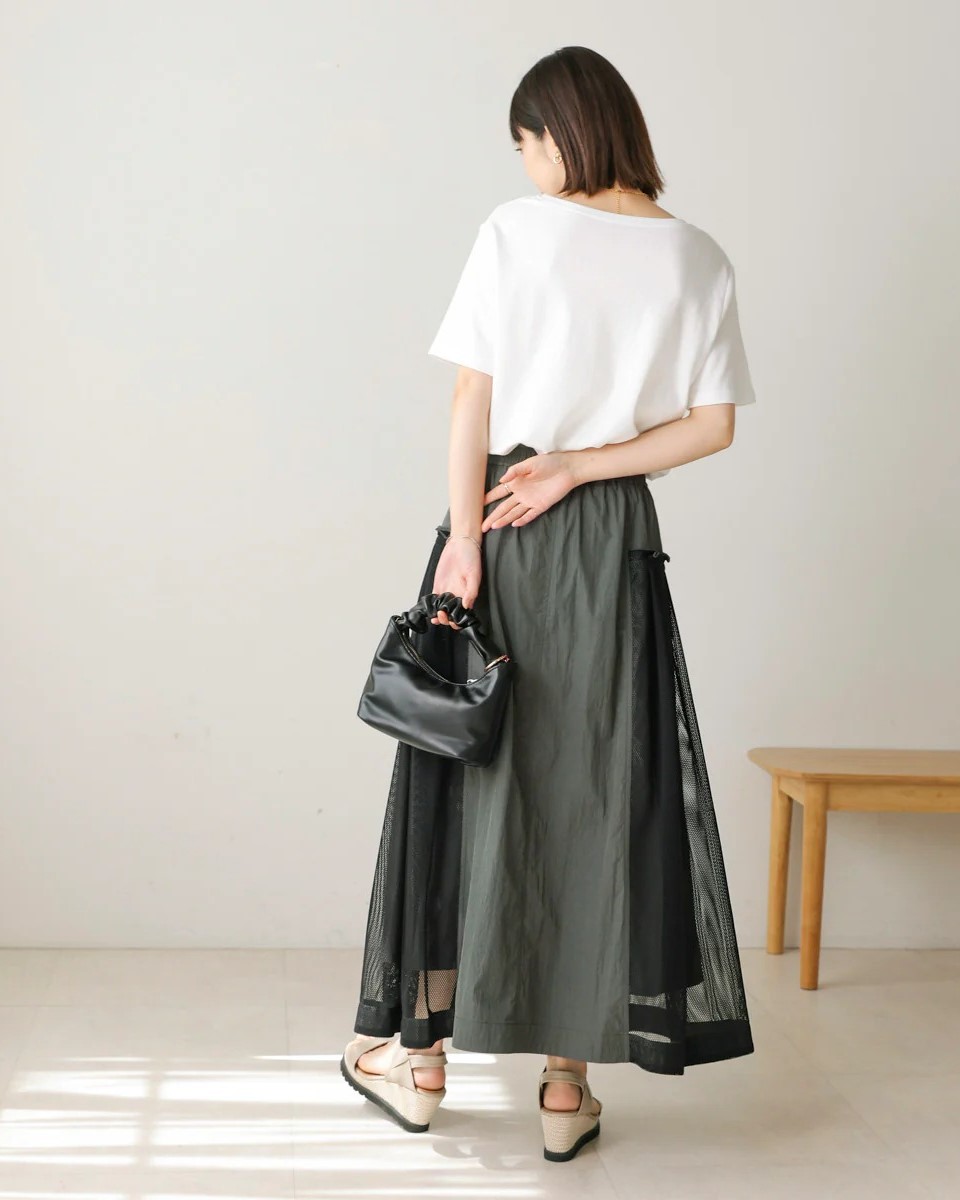 ナイロン×メッシュの異素材コンビで、スポーティブルな要素を取り入れつつ、女性らしさのあるフレアシルエットに仕上げたスカート。
