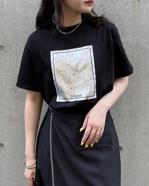 箔プリントとブラックロゴの組み合わせが、モード感漂う雰囲気を演出します。