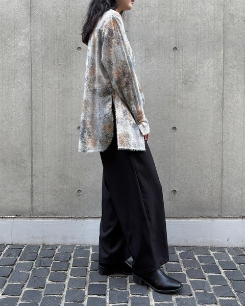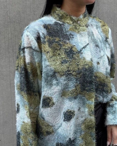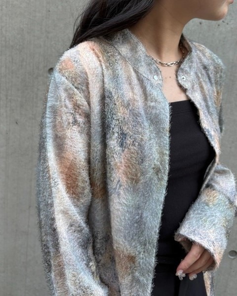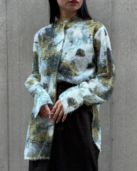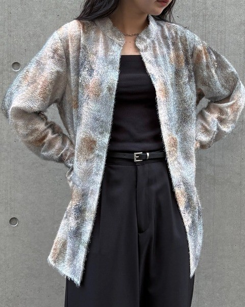短いフェザー生地に水彩画を滲ませたようなアート柄が目を惹く一枚。