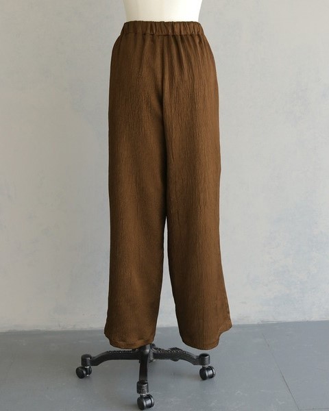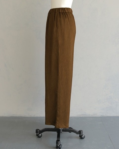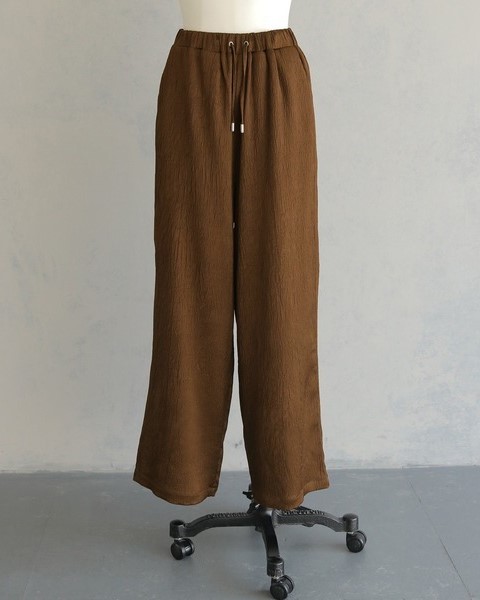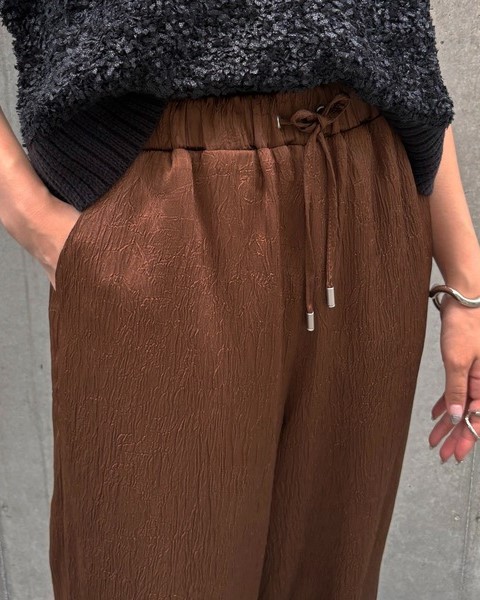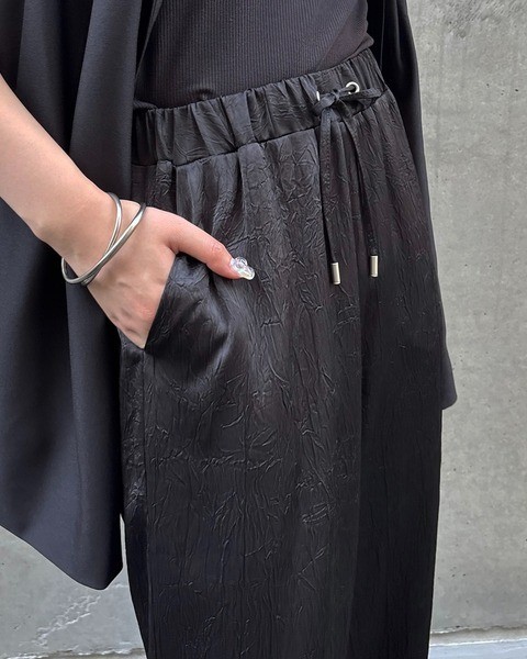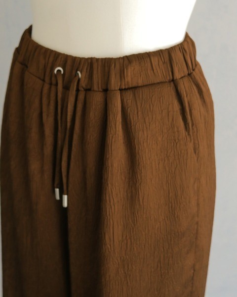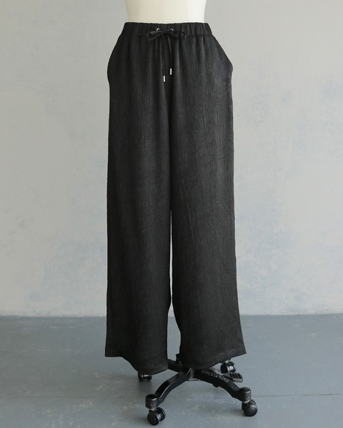 上品な光沢を抑えたマットサテン素材を使用し、ウエストはゴム仕様でリラクシーな着心地を実現。
