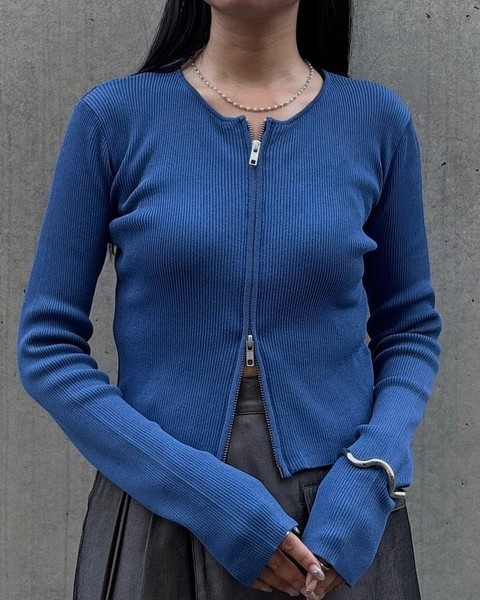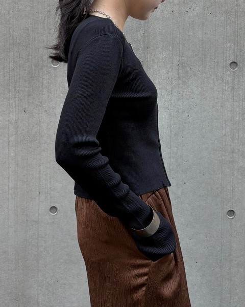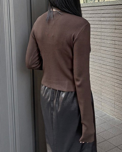 細めのリブ編みが身体のラインをきれいに見せ、クルーネックが首元をすっきりと演出。