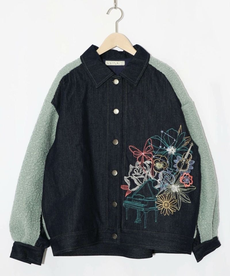 カジュアルなデニムにお花や楽器の刺繍をあしらい、