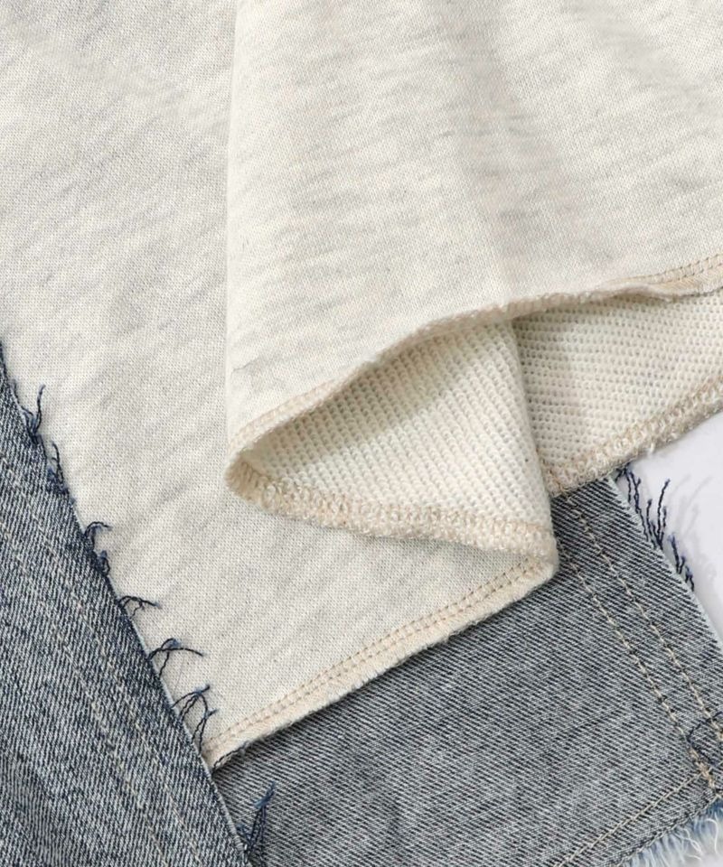 デニム素材にやわらかな裏毛カットソーをミックスし、カジュアルながらも優しい雰囲気に仕上げました。