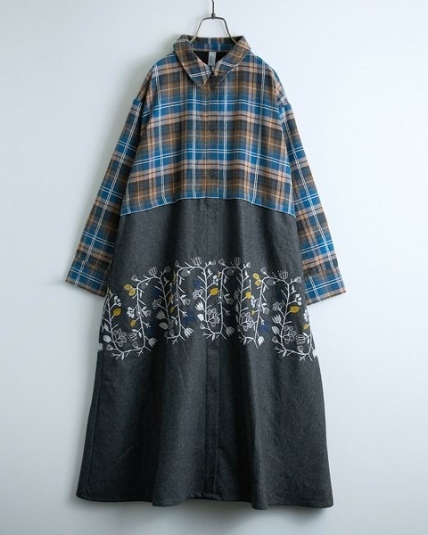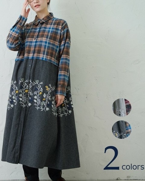 起毛チェックと起毛ヘリンボーンを組み合わせたドッキングワンピース。