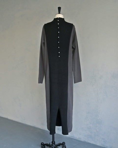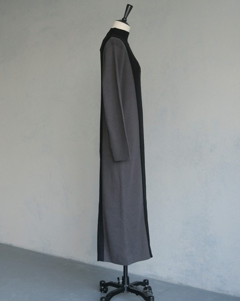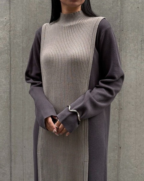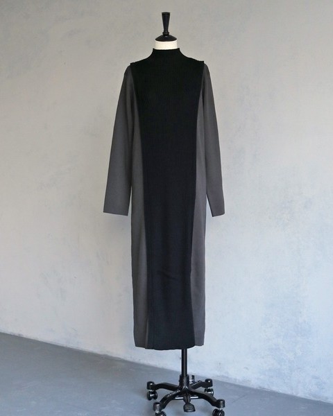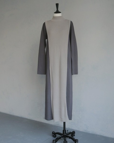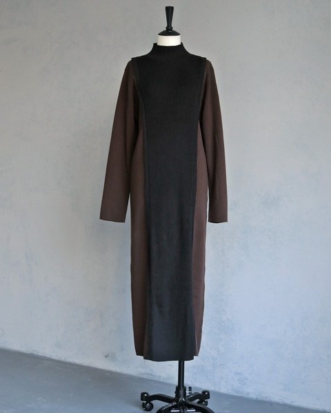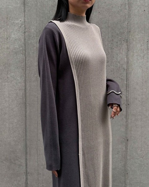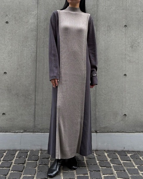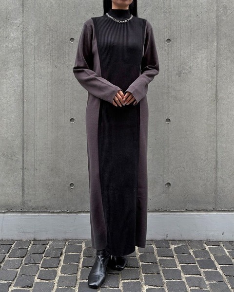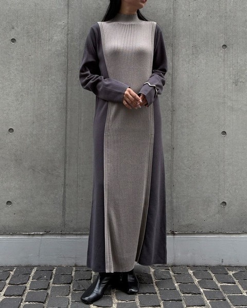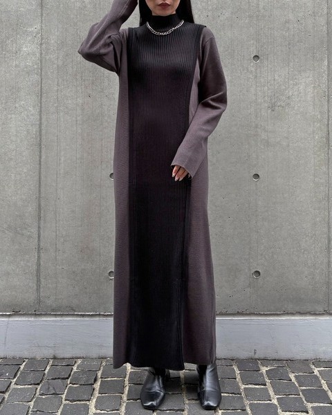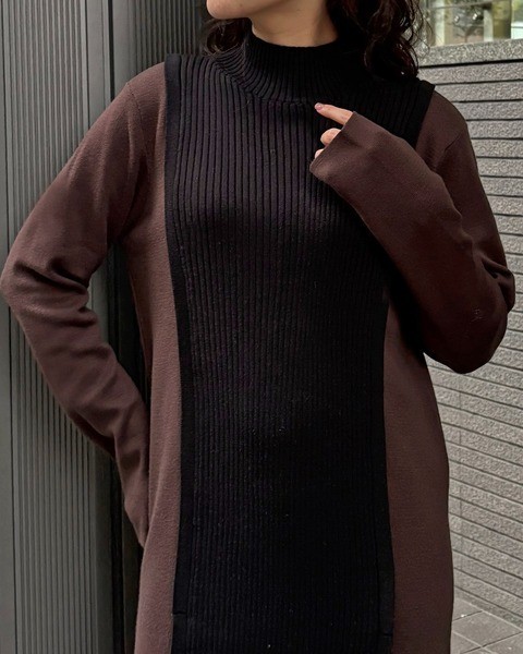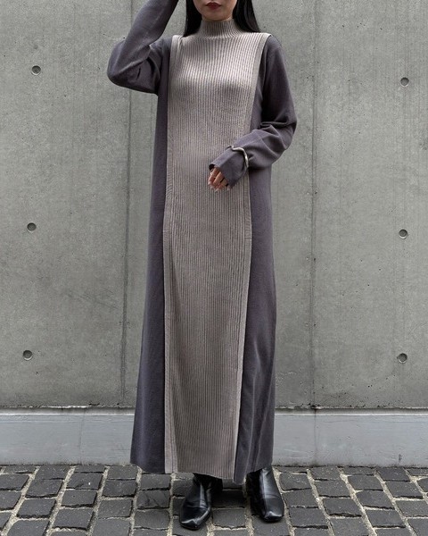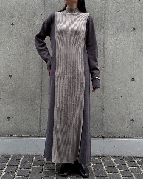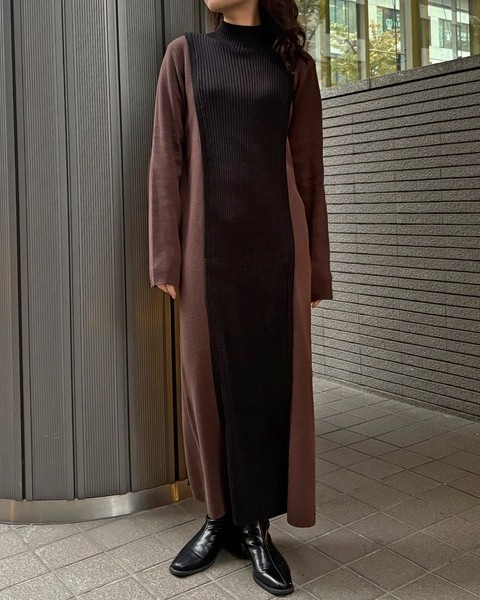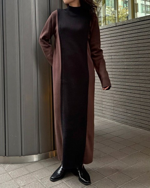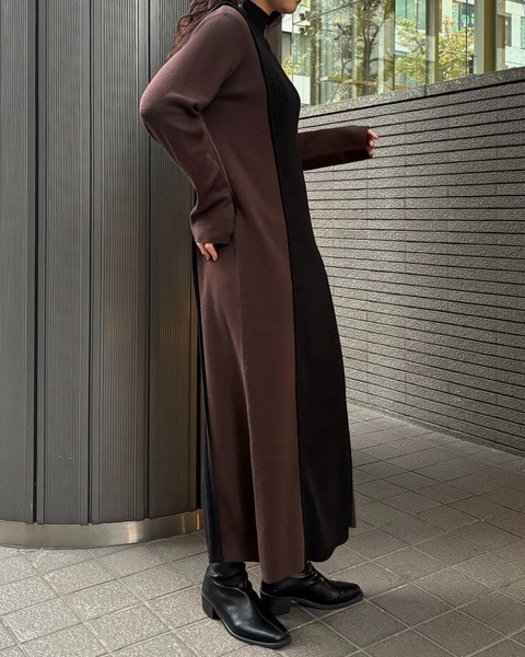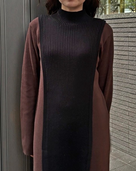 編地の切替によるバイカラーが目をひくニットワンピース。