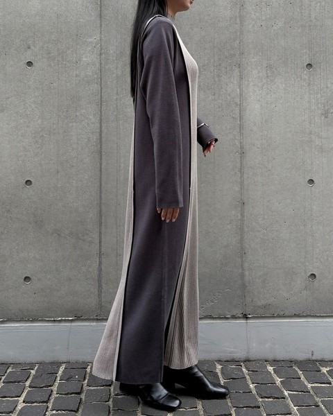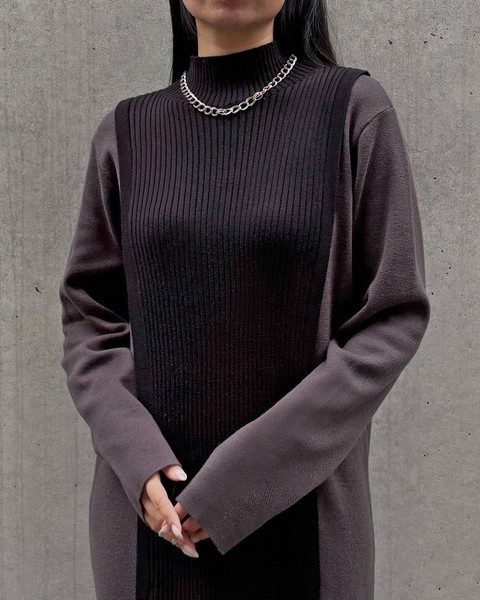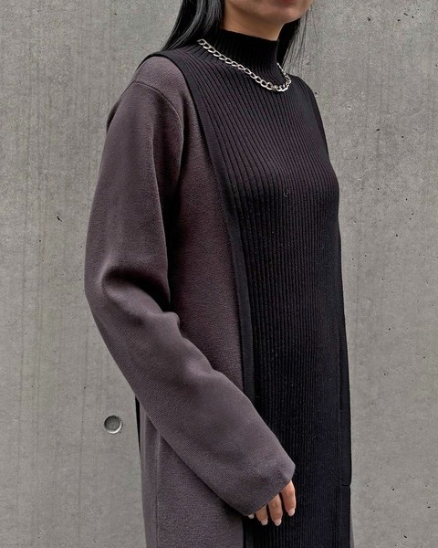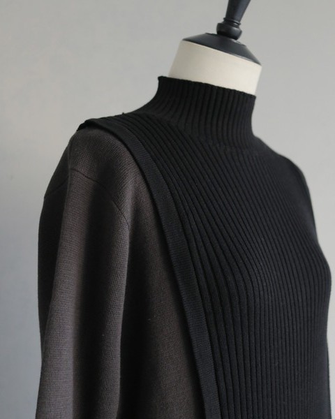中心部分にはリブ編地を採用し、バイカラーの切替とともに縦ラインを強調してすっきりとした印象に。