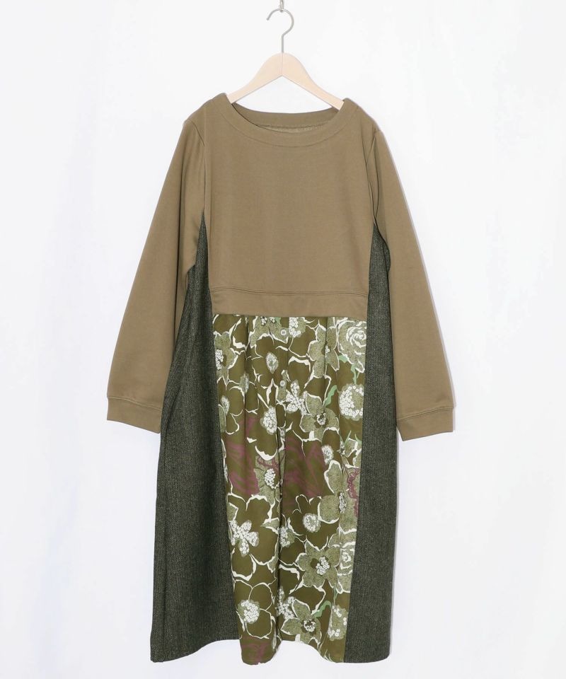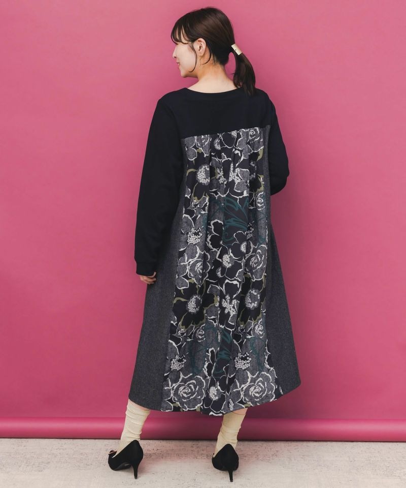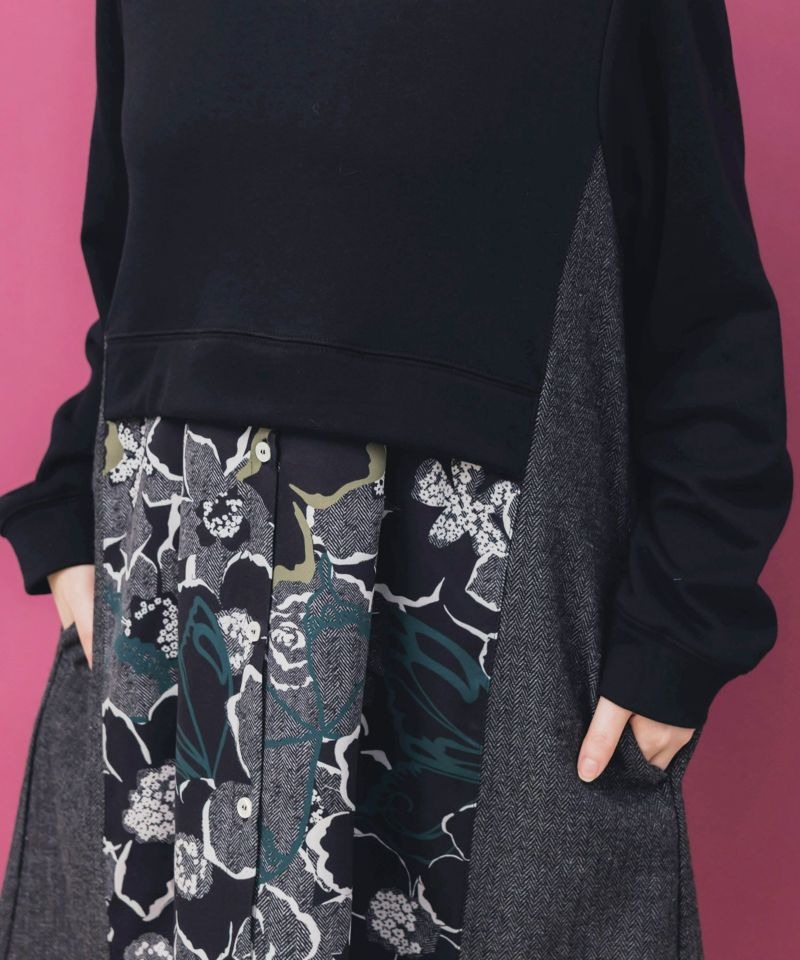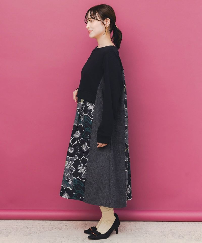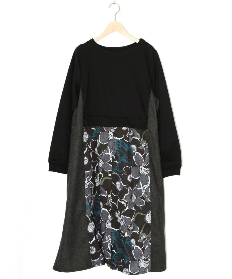 イズスカラー / 花柄ヘリンボーン×裏毛×布帛 異素材切替ワンピース