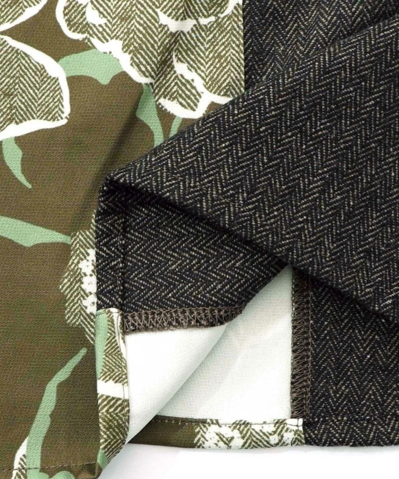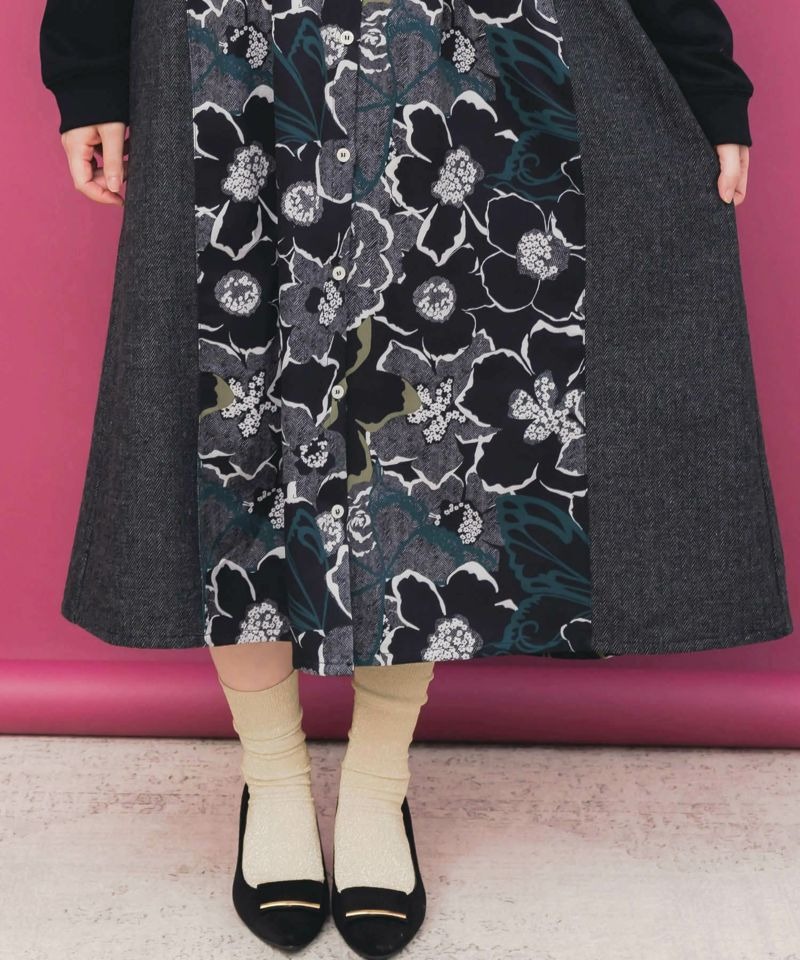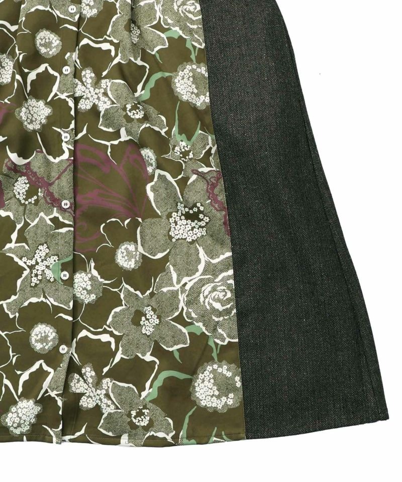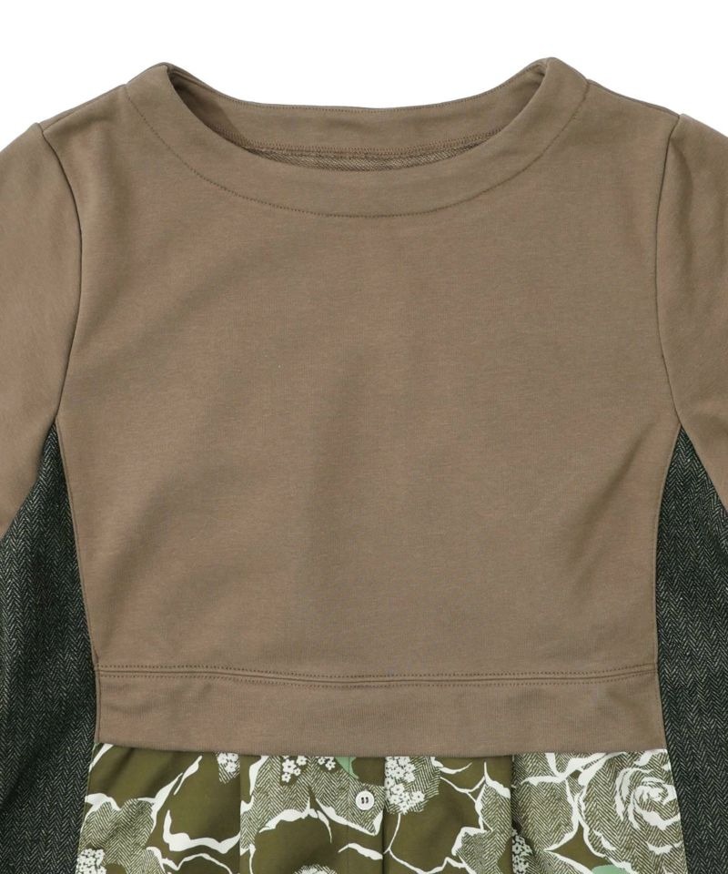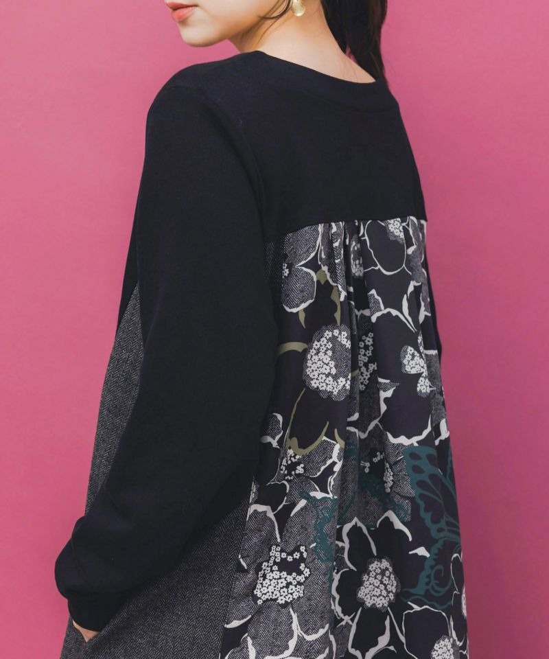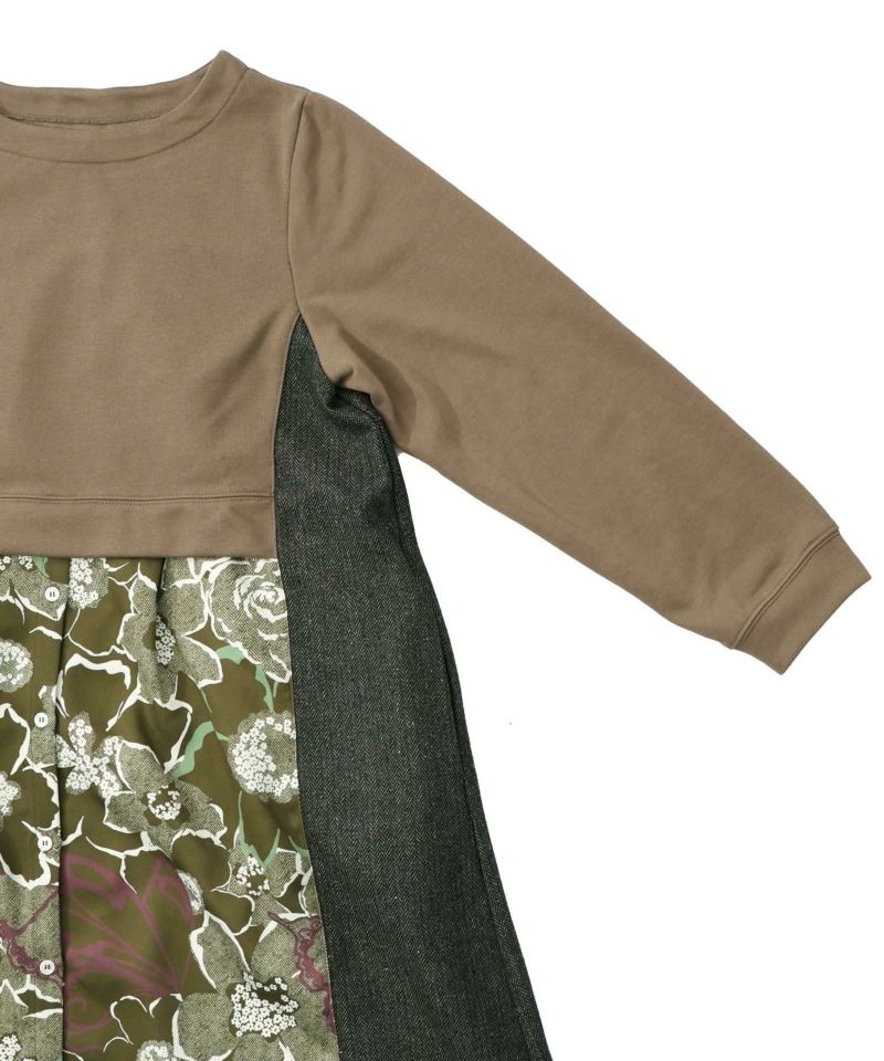 イズスカラー / 花柄ヘリンボーン×裏毛×布帛 異素材切替ワンピース