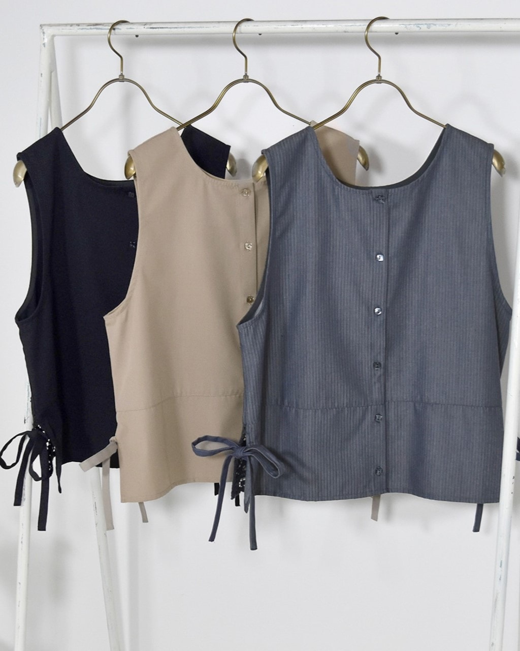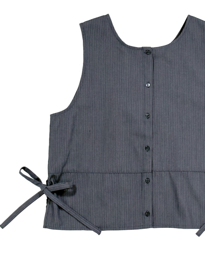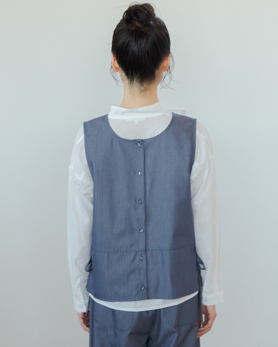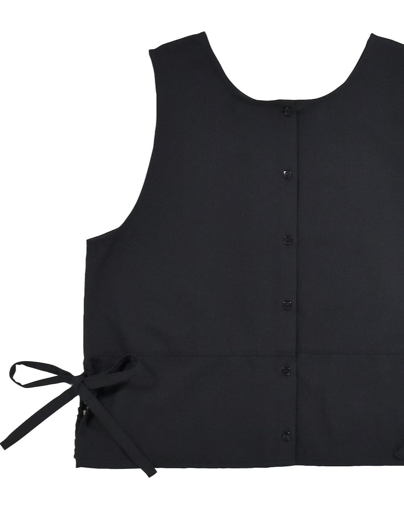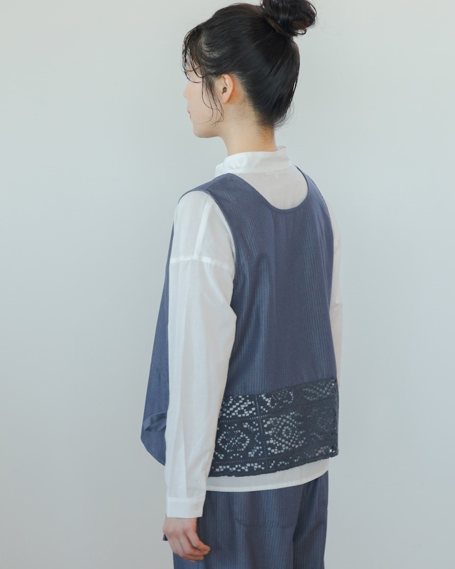 裾にレースの切り替えが入った上品な雰囲気のA面と、ボタンあきでシンプルに着られるB面の両方が楽しめる2WAYベスト。