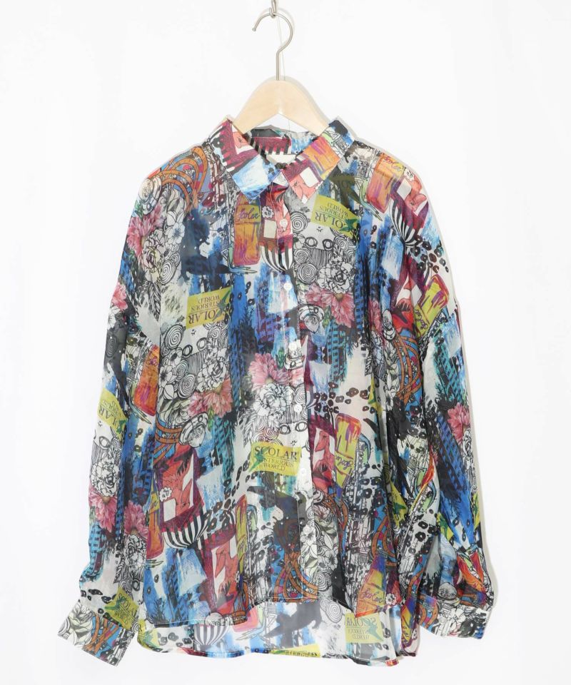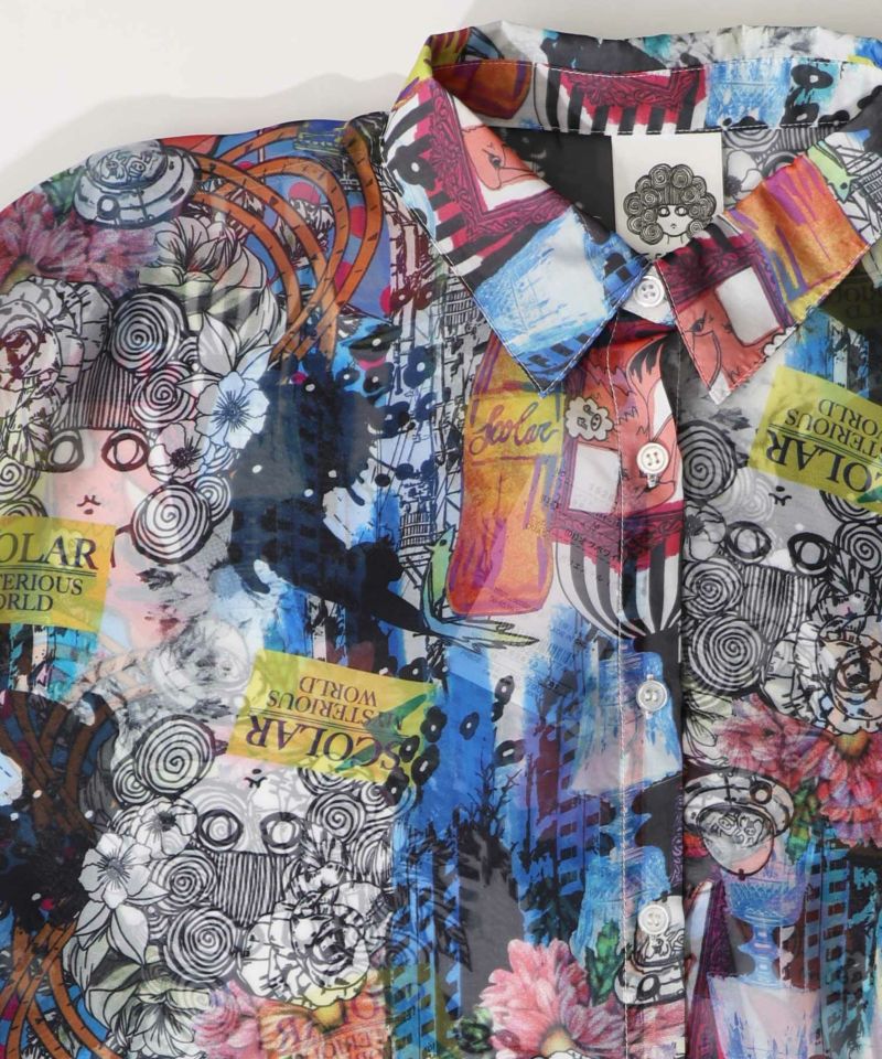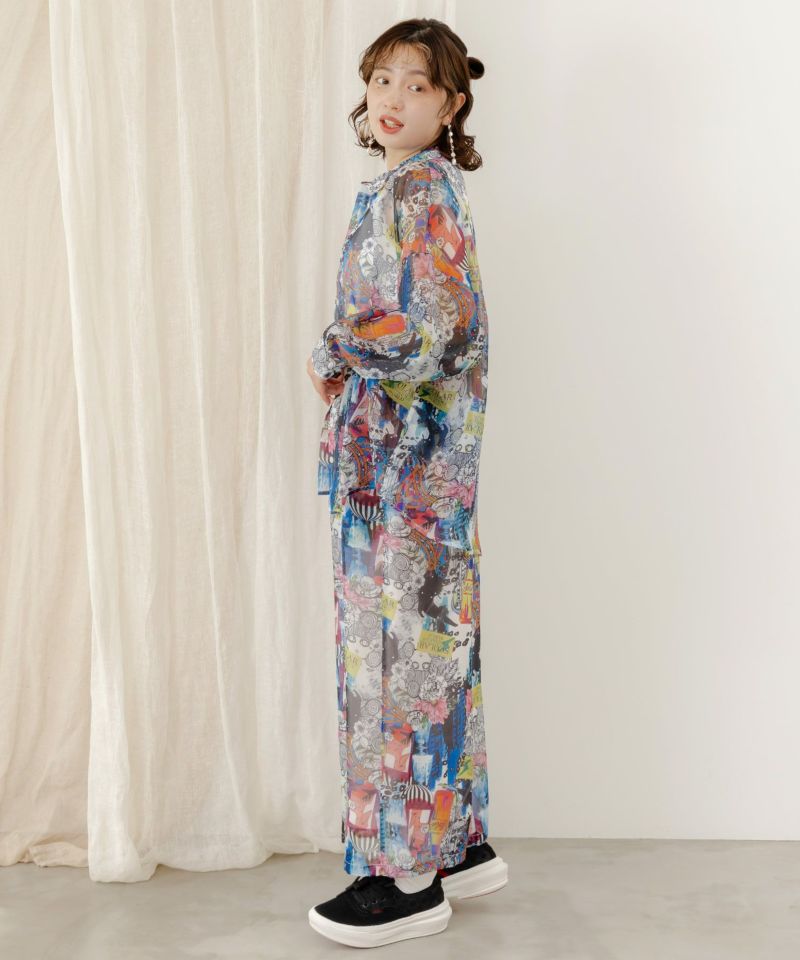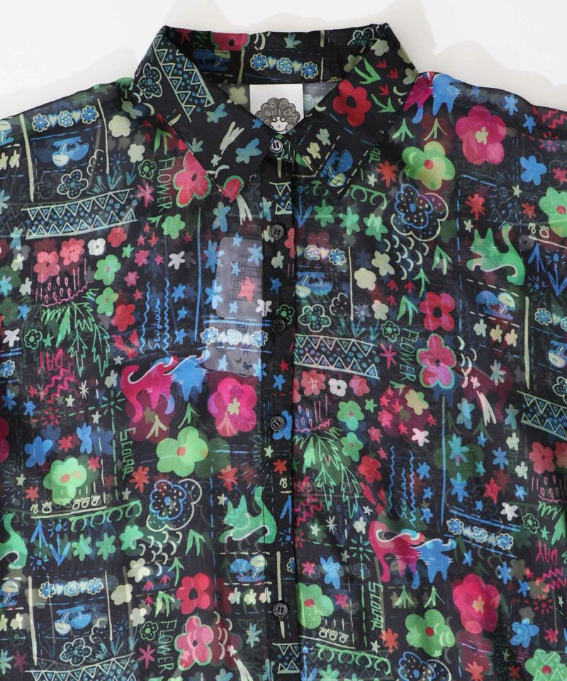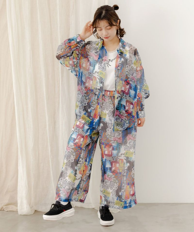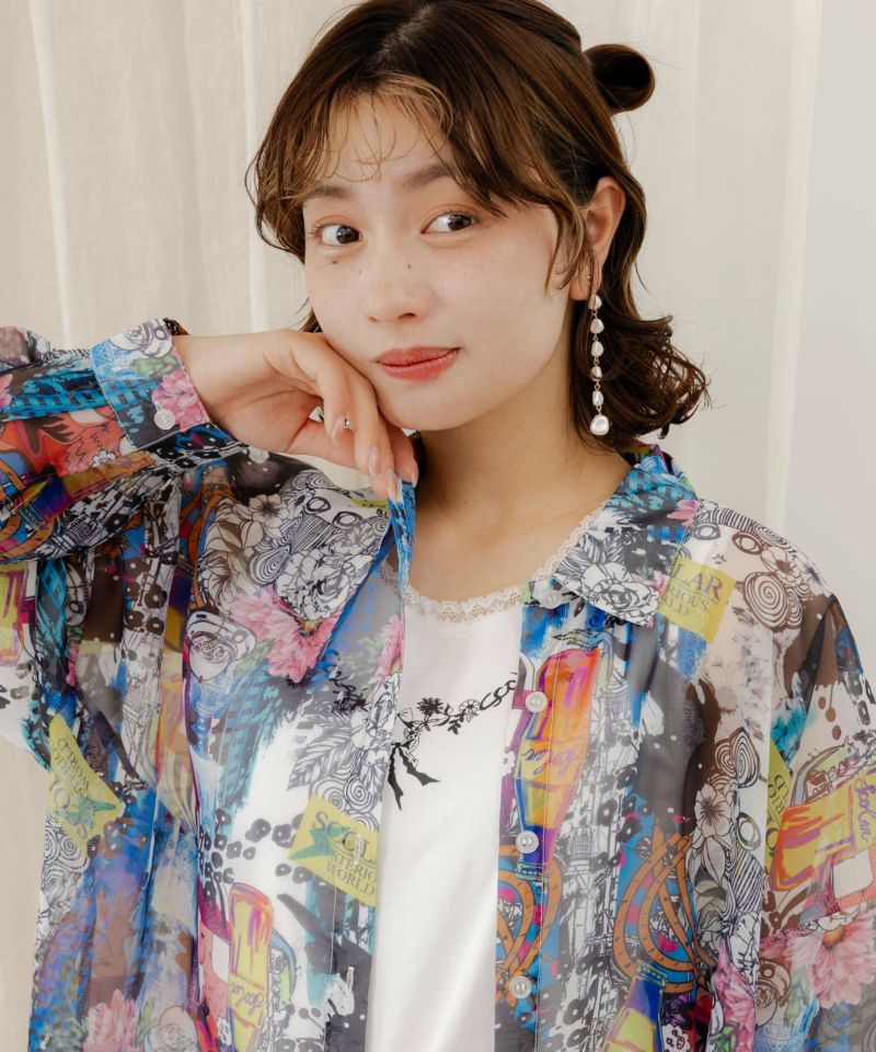 同柄のシアーパンツとセットで着用できる、POPでカラフルな総柄シアーシャツ。