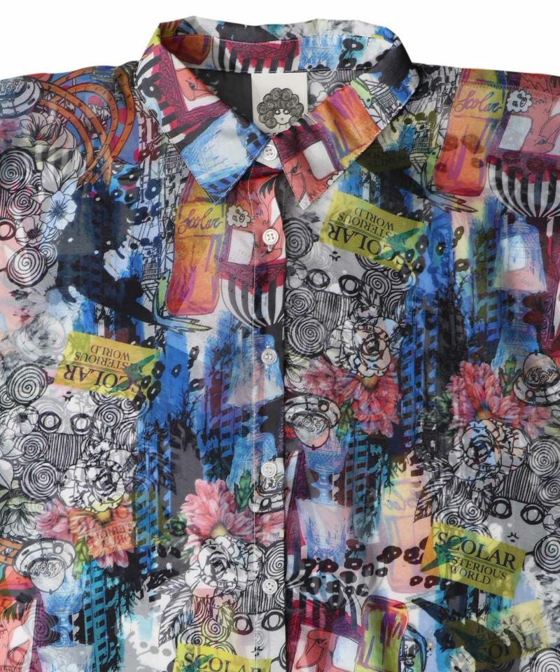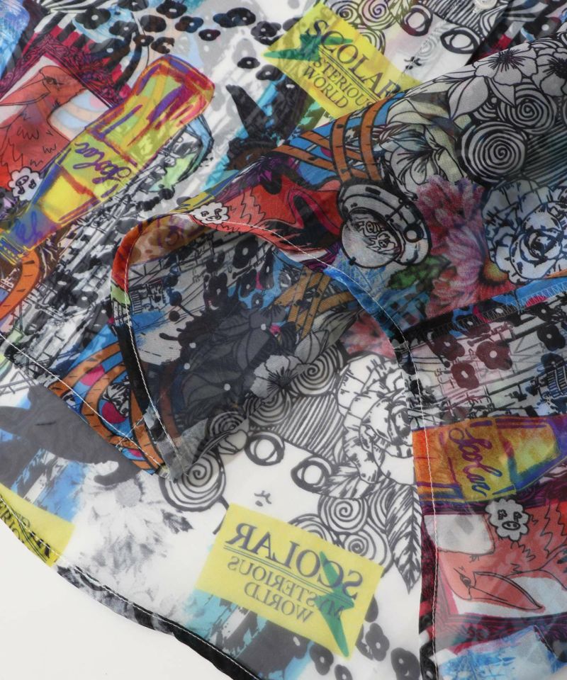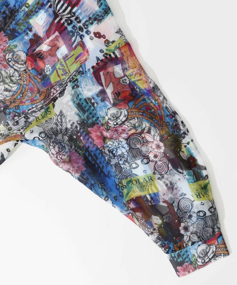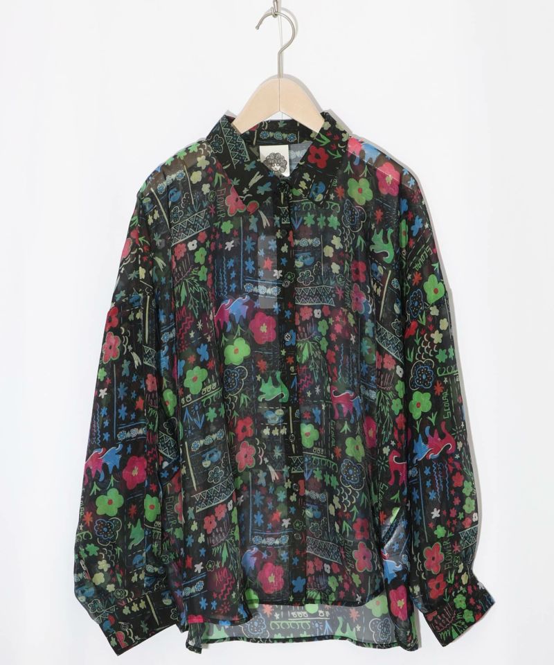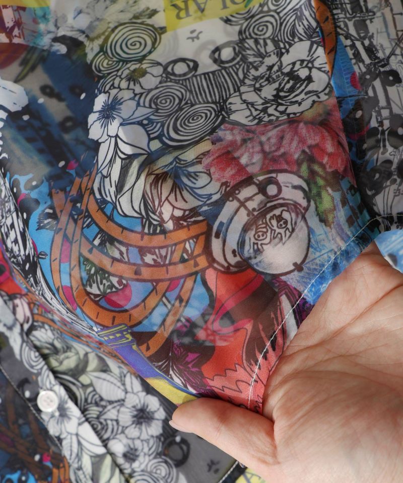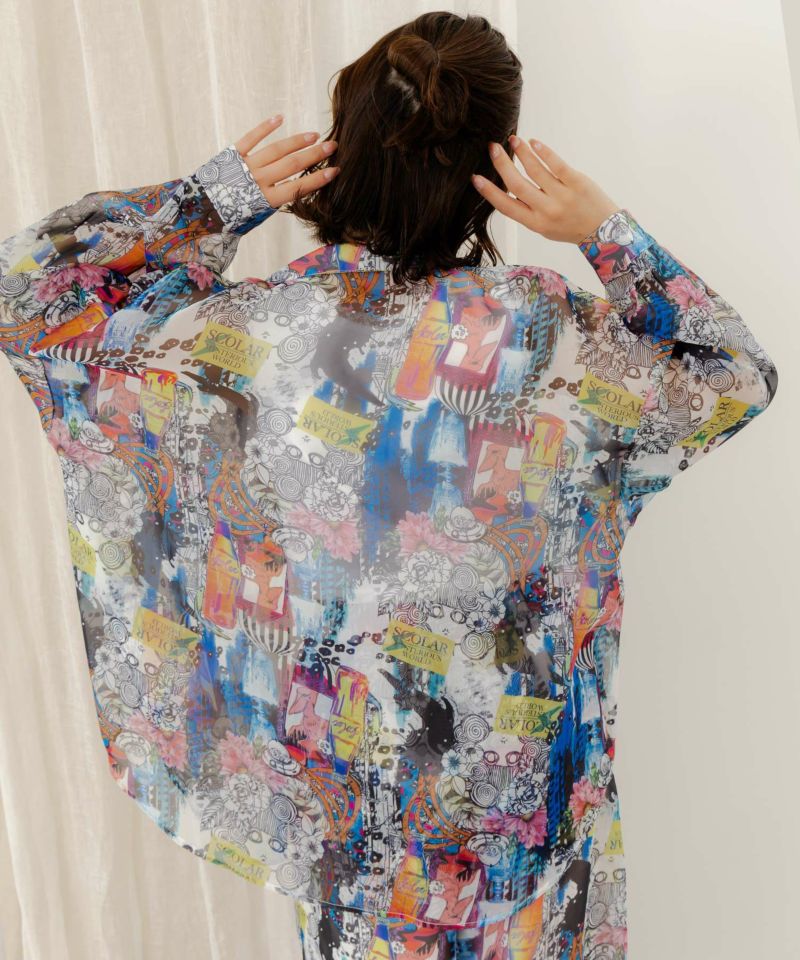 同柄のシアーパンツとセットで着用できる、POPでカラフルな総柄シアーシャツ。