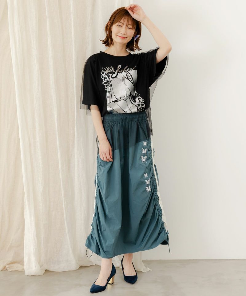 サイドにギャザーを寄せ、ラインに沿って蝶柄刺繍をあしらった