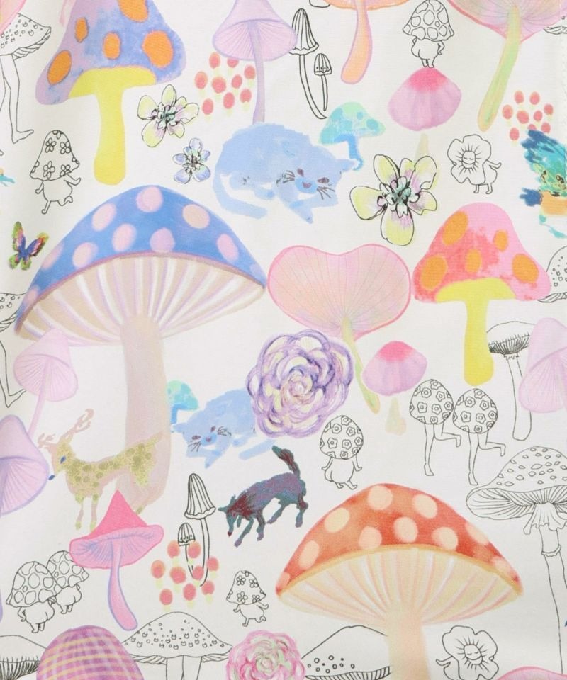 05(アイボリー):森のキノコや動物たちが優しいタッチで描かれたメルヘン柄