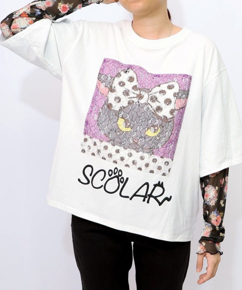 スカラー / 花とネコ柄のレイヤード風 接触冷感ロンT