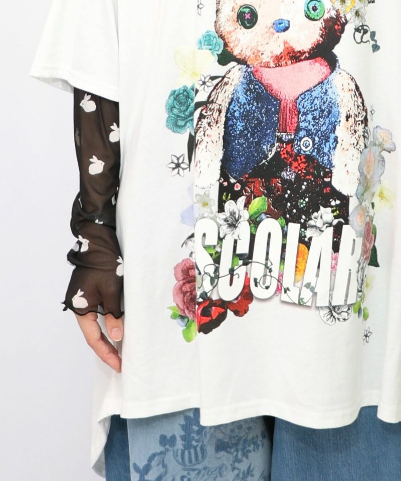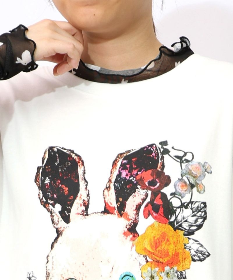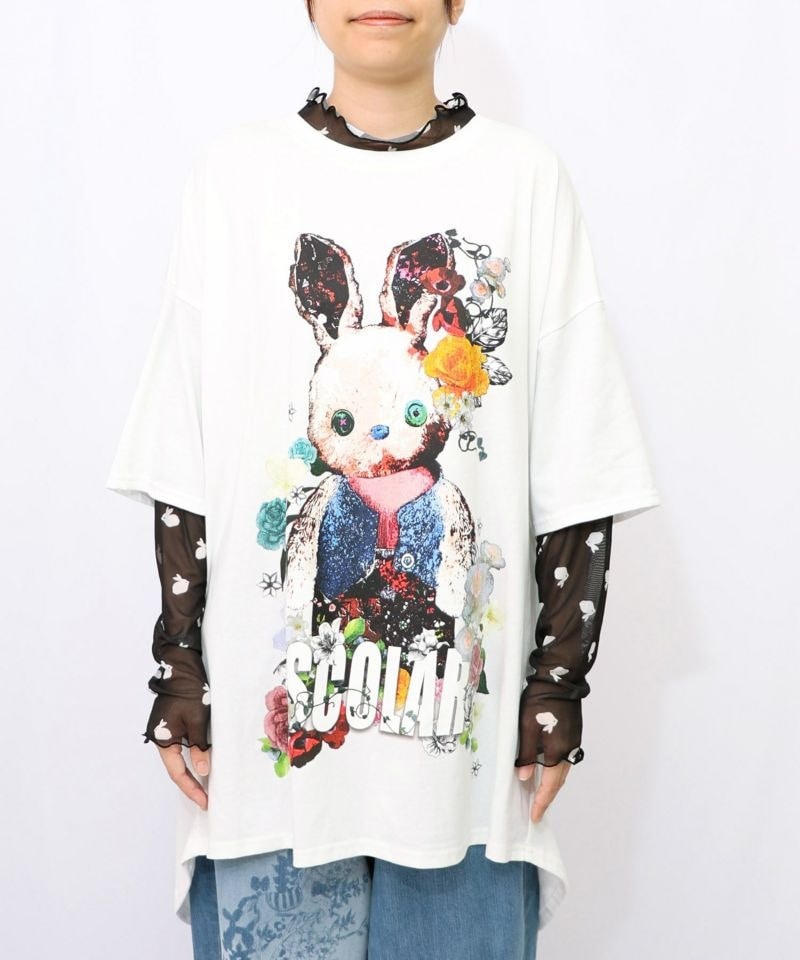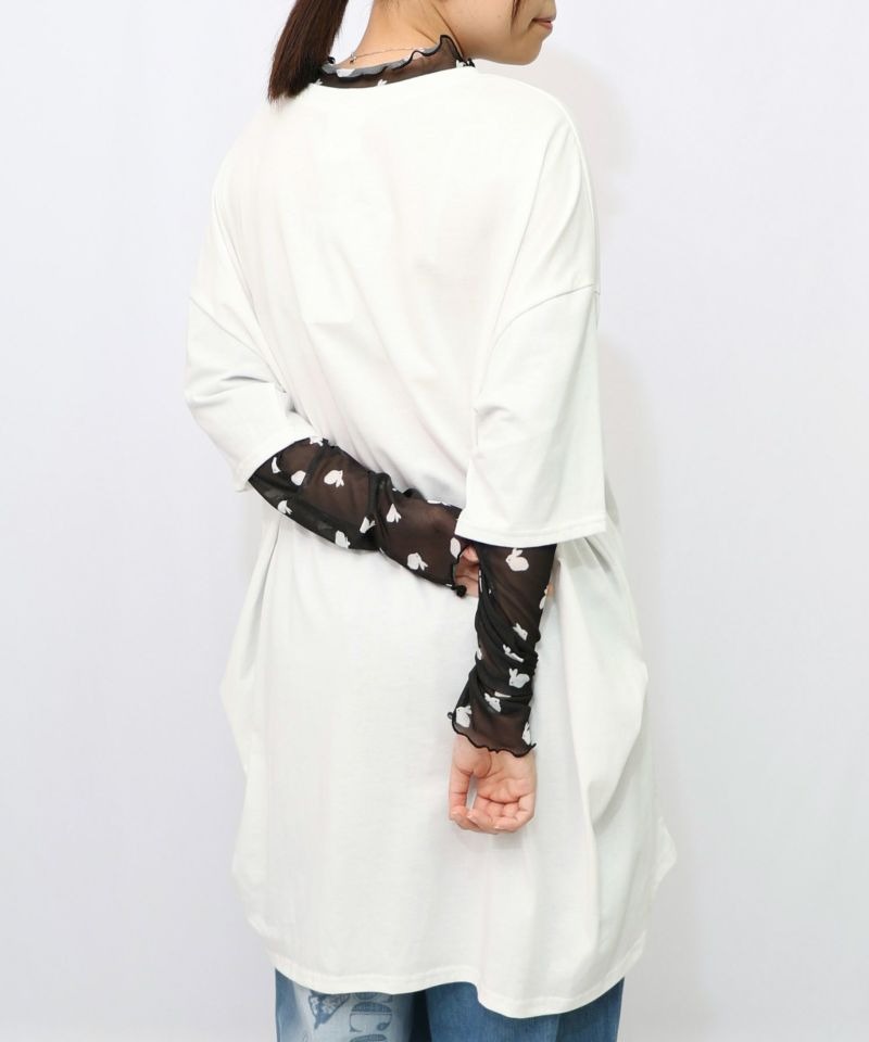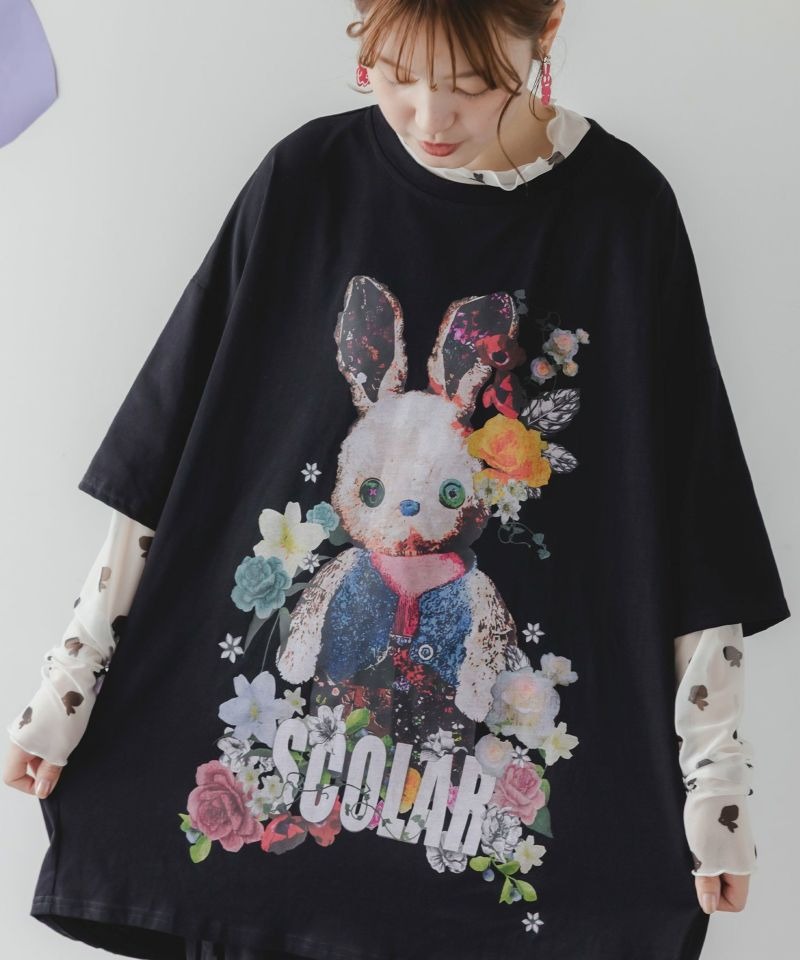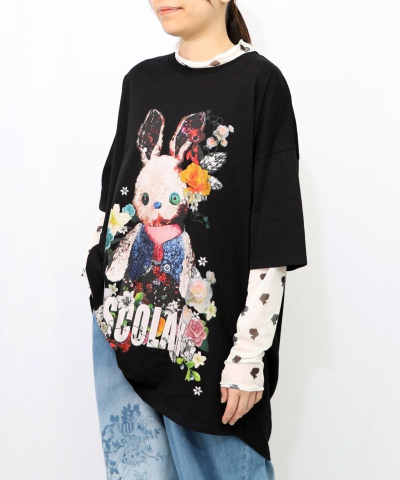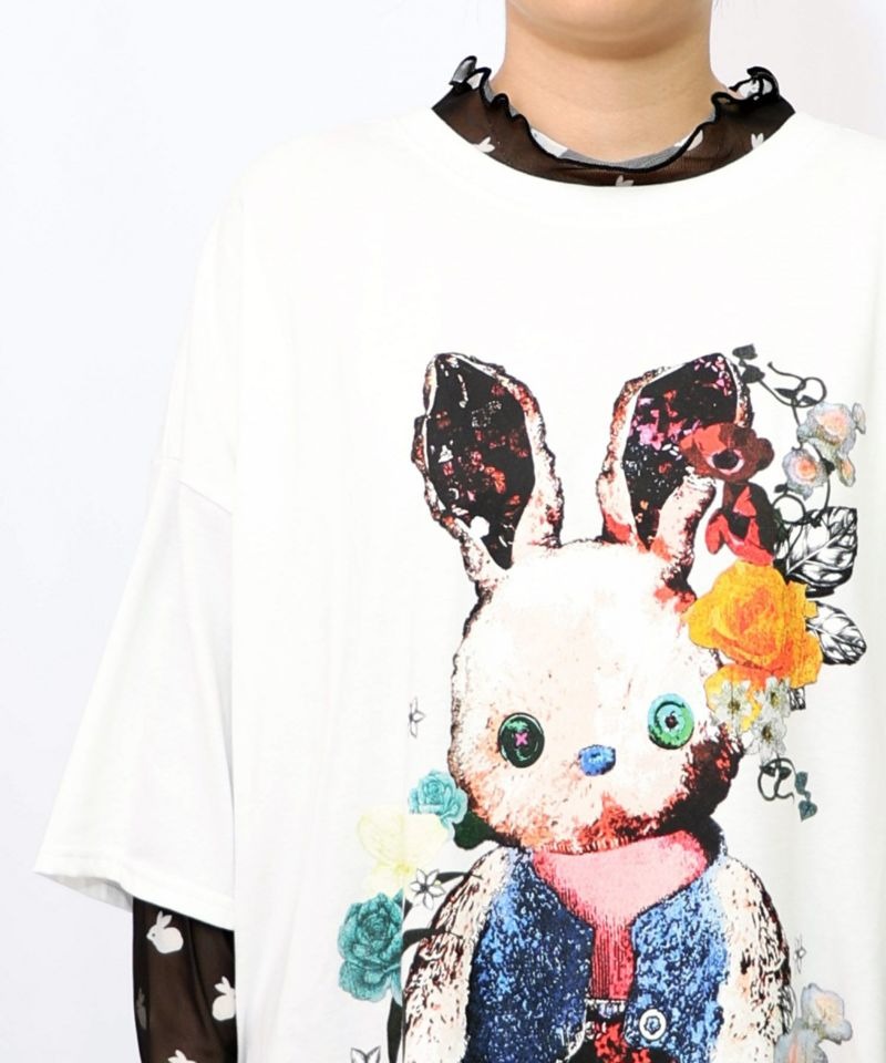 ロックなコーデにも合いそうな、ちょっぴりダークなウサギのぬいぐるみ柄チュニック。