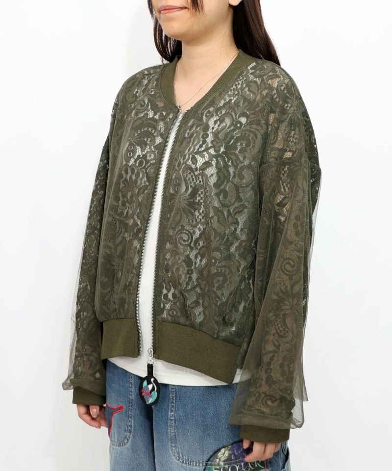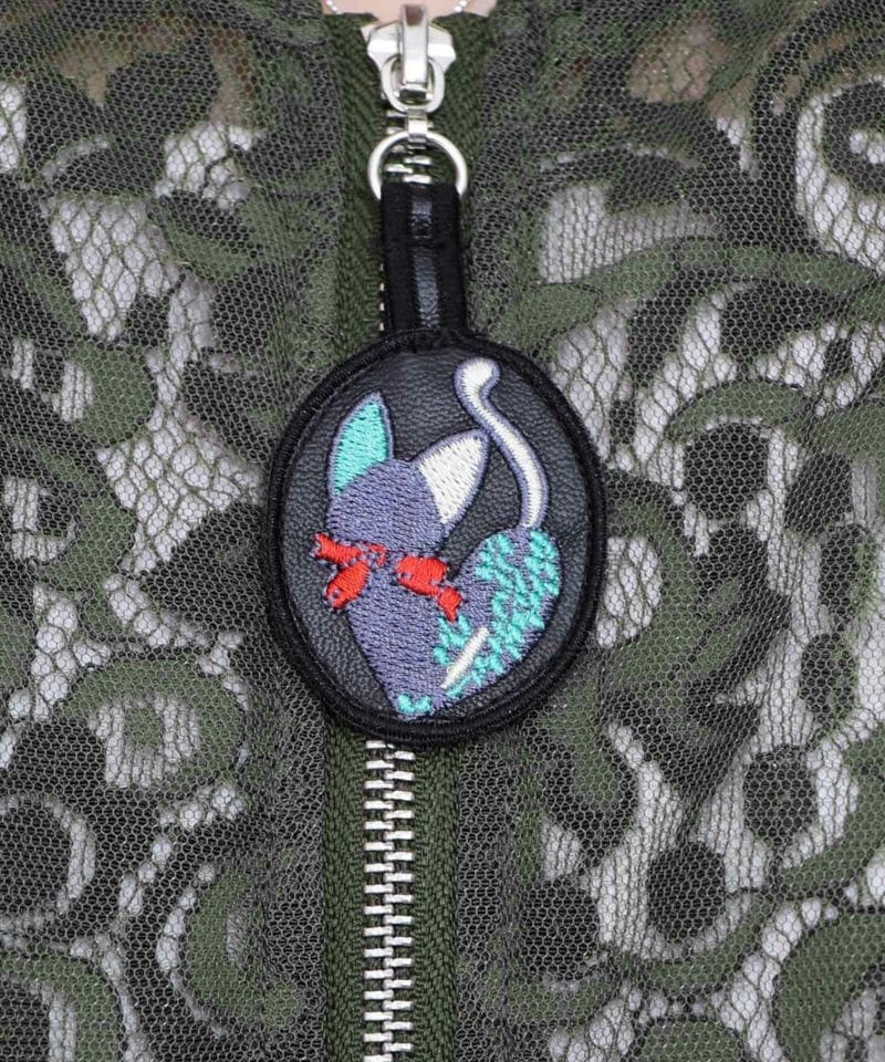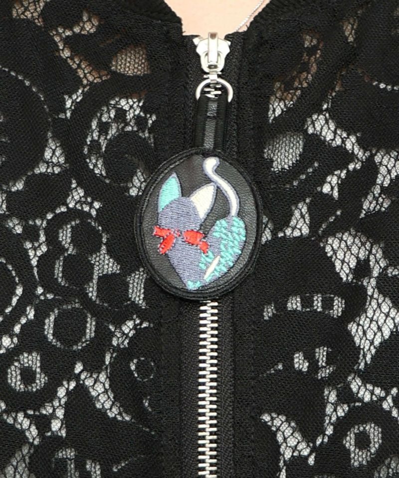 ファスナーにおめかしをしたネコの刺繍チャームがついた、フェミニンな印象のレースブルゾン。