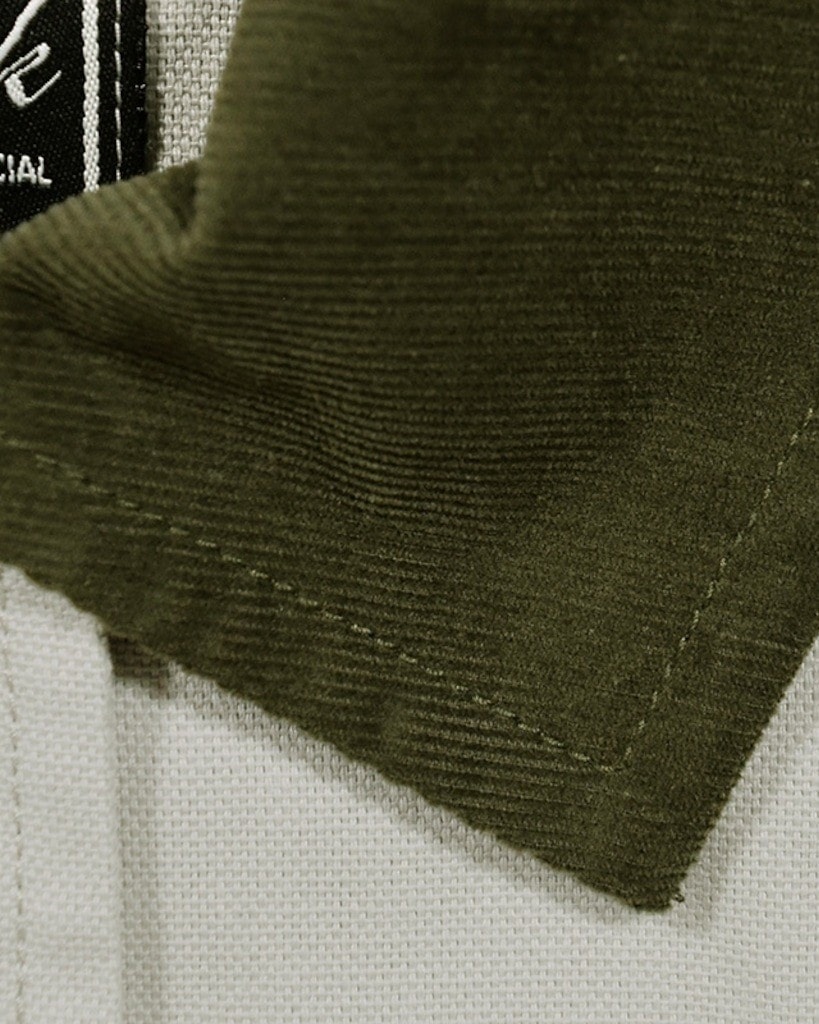 衿と袖口にはコーデュロイ生地をあしらい、異素材の組み合わせがさりげなくおしゃれなアクセントに。