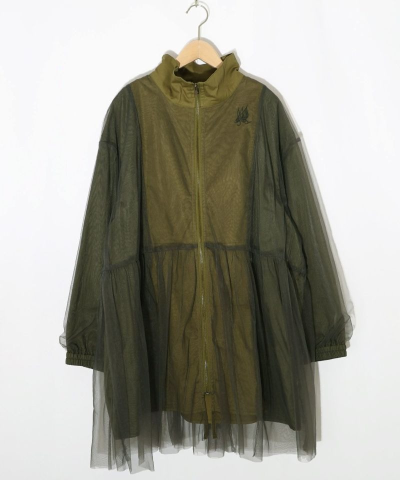 ミリタリーテイストのジャケットにふんわりチュールを重ねて甘さをプラス。
