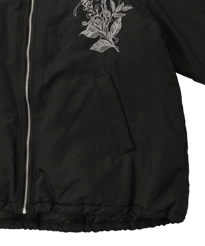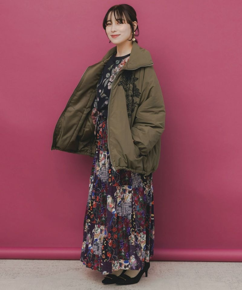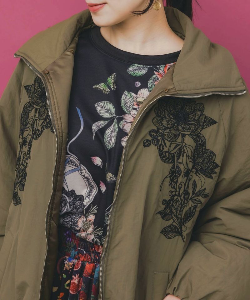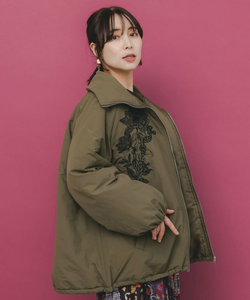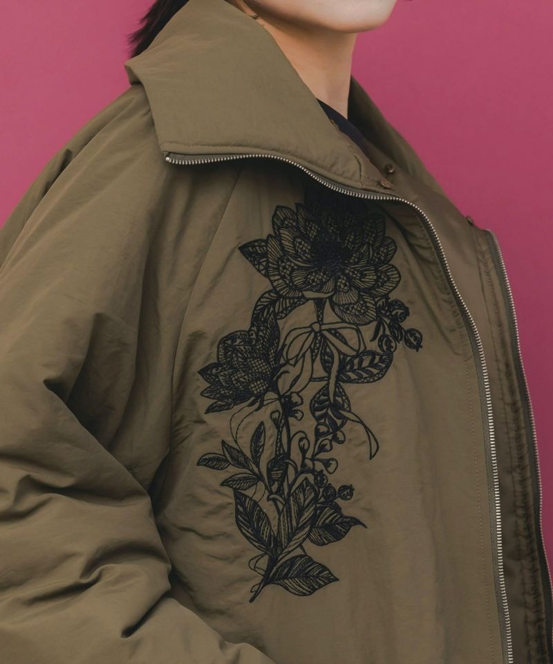 胸元に左右対称で咲く、大きなお花とリボンの刺繍が印象的な中綿ブルゾン。